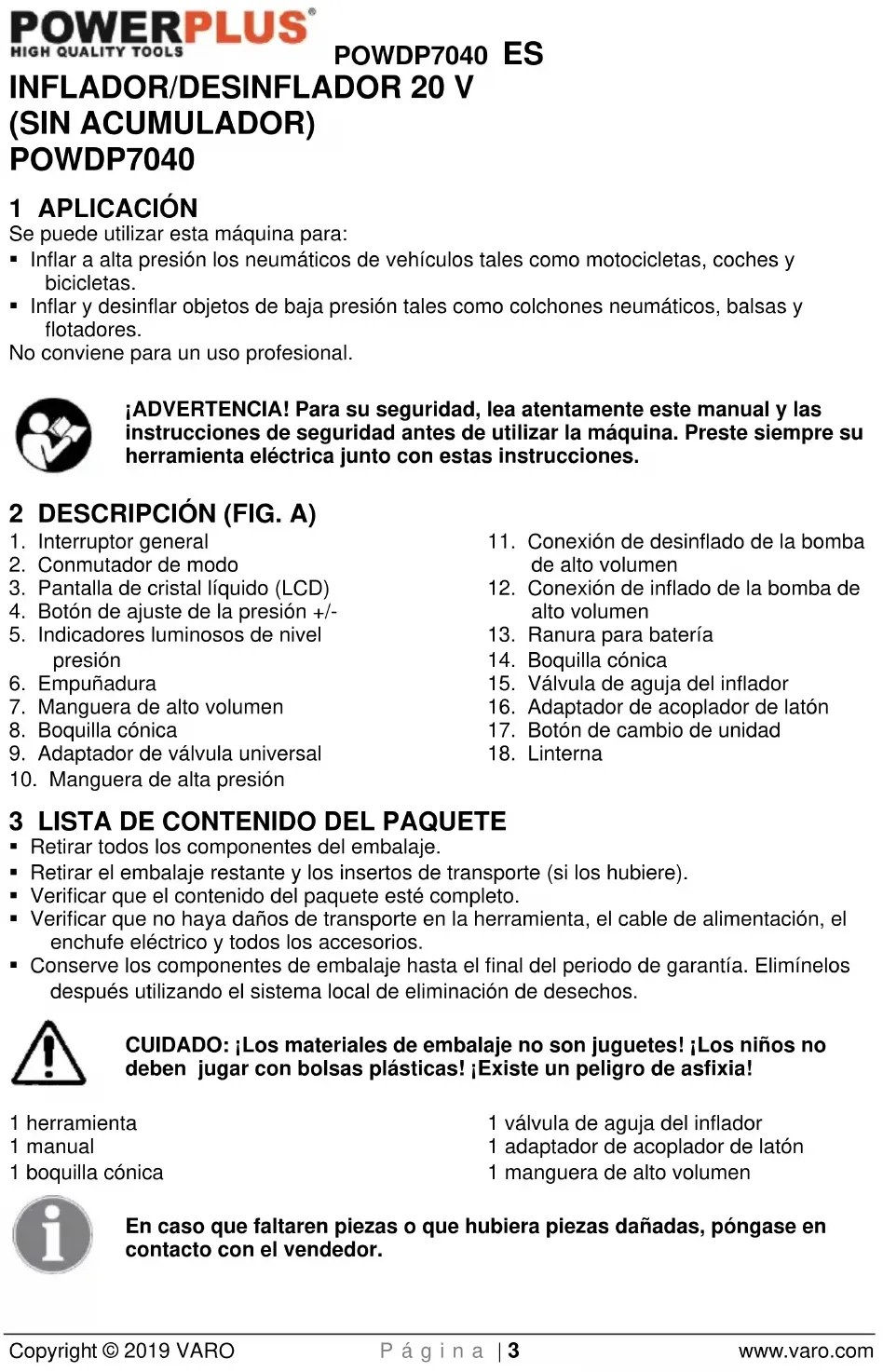 VARO N.V. – Joseph Van Instraat 9. BE2500 Lier – Bélgica, declara que: Tipo de aparato: INFLADOR/DESINFLADOR 20 V Marca: POWERplus Número del producto: POWDP7040 está en conformidad con los requisitos esenciales y otras disposiciones pertinentes de las Directivas europeas aplicables, basados en la aplicación de las normas europeas armonizadas. Cualquier modificación no autorizada de este aparato anula esta declaración. Directivas europeas (incluyendo, si se aplica, sus respectivas enmiendas hasta la fecha de la firma): 2011/65/EU 2014/30/EU 2006/42/EC Normas europeas armonizadas (incluyendo, si se aplica, sus respectivas hasta la fecha de la firma): EN 60204-1:2006 EN 1012-1:2010 EN 60335-1:2012 EN55014-1 : 2017 EN55014-2 : 2015 EN61000-3-2 : 2014 EN61000-3-3 : 2013 Custodio de la documentación técnica: Philippe Vankerkhove, VARO – Vic. Van Rompuy N.V. El suscrito actúa en nombre del director general de la compañía, Hugo Cuypers Certification Manager Lier, 04/01/2019POWDP7040 IT Copyright © 2019 VARO P a g i n a | 1 www.varo.com 1 APPLICAZIONE .............................................................................. 3