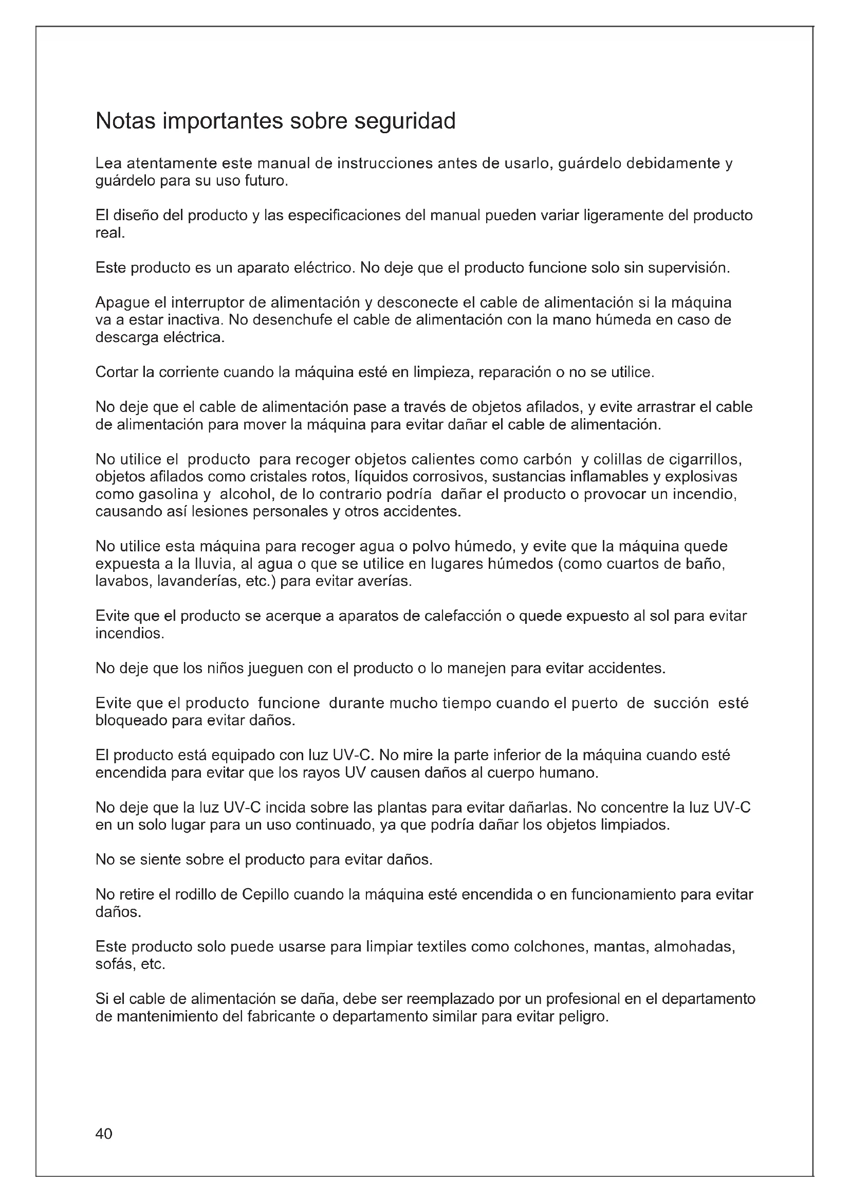 Diagramma del circuito elettrico 220-240V~ 50-60Hz39 Informazioni sulla garanzia Questo prodotto gode di un anni di garanzia dalla data di acquisto. Sono escluse dalla garanzia la normale usura, l'uso commerciale, le alterazioni dell'apparecchio, le attività di pulizia non consone, l’utilizzo improprio o i danni causati da parte dell'acquirente o di terzi, danni imputabili a circostanze esterne.40 Notas importantes sobre seguridad Lea atentamente este manual de instrucciones antes de usarlo, guárdelo debidamente y guárdelo para su uso futuro. El diseño del producto y las especicaciones del manual pueden variar ligeramente del producto real. Este producto es un aparato eléctrico. No deje que el producto funcione solo sin supervisión. Apague el interruptor de alimentación y desconecte el cable de alimentación si la máquina va a estar inactiva. No desenchufe el cable de alimentación con la mano húmeda en caso de descarga eléctrica. Cortar la corriente cuando la máquina esté en limpieza, reparación o no se utilice. No deje que el cable de alimentación pase a través de objetos alados, y evite arrastrar el cable de alimentación para mover la máquina para evitar dañar el cable de alimentación. No utilice el producto para recoger objetos calientes como carbón y colillas de cigarrillos, objetos alados como cristales rotos, líquidos corrosivos, sustancias inamables y explosivas como gasolina y alcohol, de lo contrario podría dañar el producto o provocar un incendio, causando así lesiones personales y otros accidentes. No utilice esta máquina para recoger agua o polvo húmedo, y evite que la máquina quede expuesta a la lluvia, al agua o que se utilice en lugares húmedos (como cuartos de baño, lavabos, lavanderías, etc.) para evitar averías. Evite que el producto se acerque a aparatos de calefacción o quede expuesto al sol para evitar incendios. No deje que los niños jueguen con el producto o lo manejen para evitar accidentes. Evite que el producto funcione durante mucho tiempo cuando el puerto de succión esté bloqueado para evitar daños. El producto está equipado con luz UV-C. No mire la parte inferior de la máquina cuando esté encendida para evitar que los rayos UV causen daños al cuerpo humano. No deje que la luz UV-C incida sobre las plantas para evitar dañarlas. No concentre la luz UV-C en un solo lugar para un uso continuado, ya que podría dañar los objetos limpiados. No se siente sobre el producto para evitar daños. No retire el rodillo de Cepillo cuando la máquina esté encendida o en funcionamiento para evitar daños. Este producto solo puede usarse para limpiar textiles como colchones, mantas, almohadas, sofás, etc. Si el cable de alimentación se daña, debe ser reemplazado por un profesional en el departamento de mantenimiento del fabricante o departamento similar para evitar peligro.41 Montaje del producto Nombre de las piezas Botón de modo Botón de encendido/apagado Pantalla LED Picaporte de la tapa del rodillo de cepillado Tapa del rodillo de cepillado Cepillo Luz ultravioleta Generador ultrasónico Mini cepillado Filtro HEPA Cable de alimentación Lista de empaque Aspiradora antiácaros Mini cepillado Filtro HEPA Manual del usuario