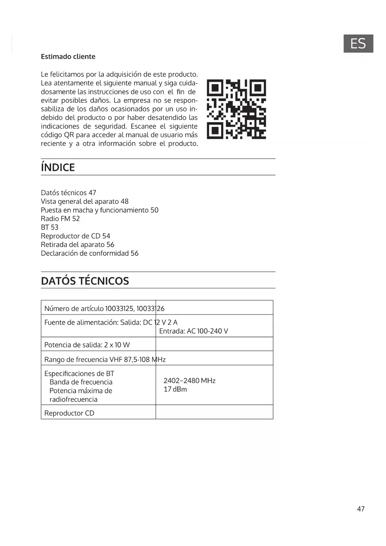 Datós técnicos 47 Vista general del aparato 48 Puesta en macha y funcionamiento 50 Radio FM 52 BT 53 Reproductor de CD 54 Retirada del aparato 56 Declaración de conformidad 56 ÍNDICE Estimado cliente Le felicitamos por la adquisición de este producto. Lea atentamente el siguiente manual y siga cuida- dosamente las instrucciones de uso con el n de evitar posibles daños. La empresa no se respon- sabiliza de los daños ocasionados por un uso in- debido del producto o por haber desatendido las indicaciones de seguridad. Escanee el siguiente código QR para acceder al manual de usuario más reciente y a otra información sobre el producto.
