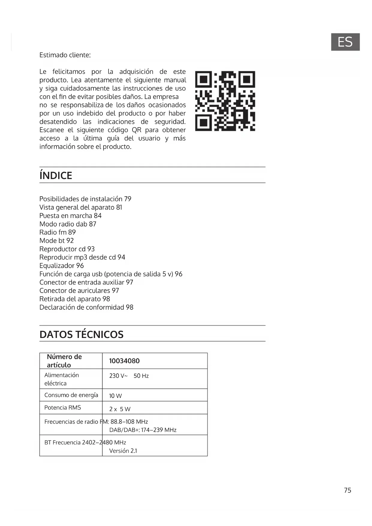 Alimentación eléctrica 230 V~ 50 Hz Consumo de energía 10 W Potencia RMS 2 x 5 W Frecuencias de radio FM: 88.8–108 MHz DAB/DAB+: 174–239 MHz BT Frecuencia 2402–2480 MHz Versión 2.1 Estimado cliente: Le felicitamos por la adquisición de este producto. Lea atentamente el siguiente manual y siga cuidadosamente las instrucciones de uso con el n de evitar posibles daños. La empresa no se responsabiliza de los daños ocasionados por un uso indebido del producto o por haber desatendido las indicaciones de seguridad. Escanee el siguiente código QR para obtener acceso a la última guía del usuario y más información sobre el producto.76