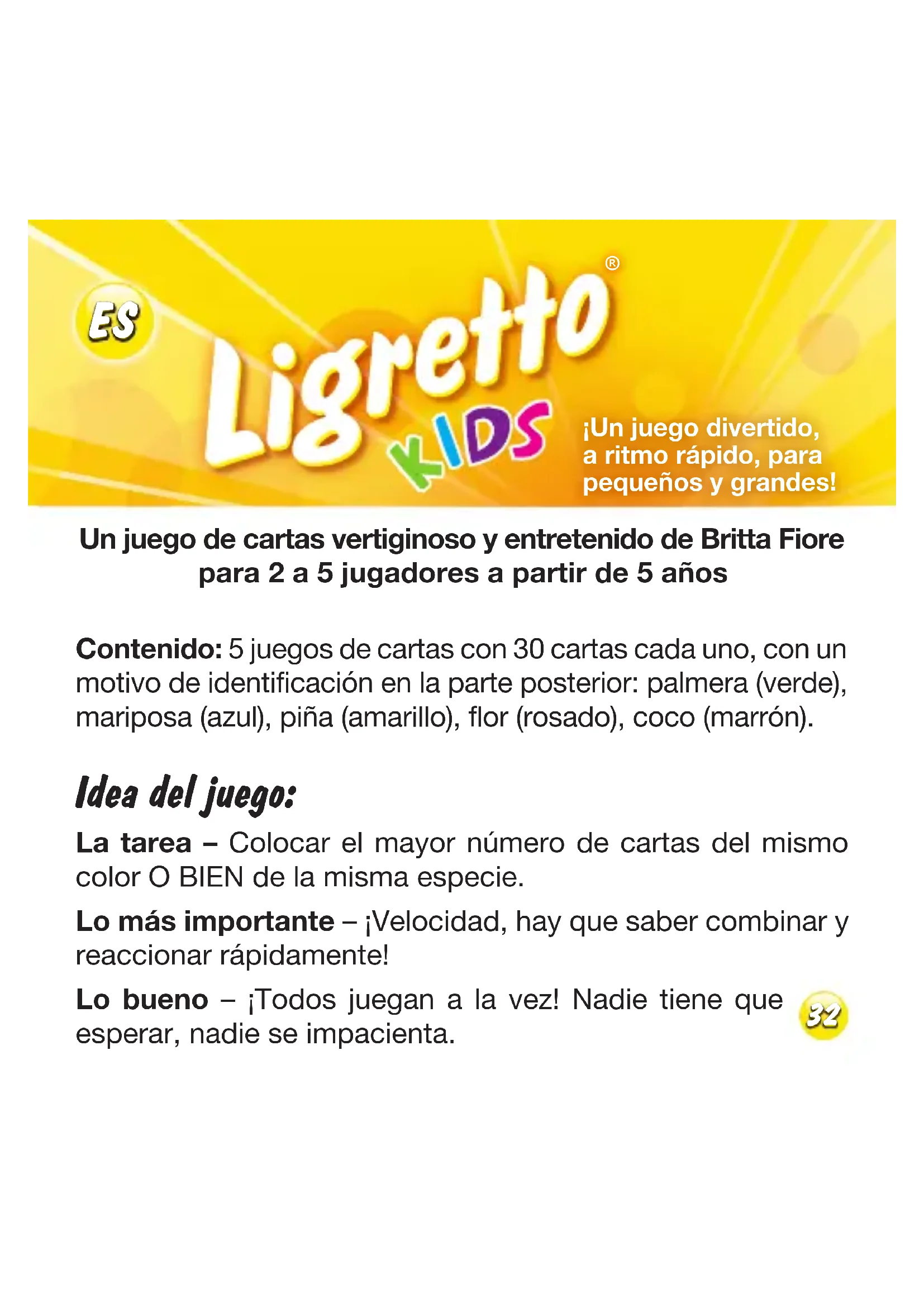 Un juego de cartas vertiginoso y entretenido de Britta Fiore para 2 a 5 jugadores a partir de 5 años Contenido: 5 juegos de cartas con 30 cartas cada uno, con un motivo de identificación en la parte posterior: palmera (verde), mariposa (azul), piña (amarillo), flor (rosado), coco (marrón). Idea del juego: La tarea – Colocar el mayor número de cartas del mismo color O BIEN de la misma especie. Lo más importante – ¡Velocidad, hay que saber combinar y reaccionar rápidamente! Lo bueno – ¡Todos juegan a la vez! Nadie tiene que esperar, nadie se impacienta. ¡Un juego divertido, a ritmo rápido, para pequeños y grandes! 32Preparación del juego: Separen las cartas según el motivo ubicado en la parte posterior (palmera, mariposa, piña, flor, coco) para formar 5 juegos de cartas. Cada jugador recibe un mazo de 30 cartas cada uno. Cada uno de los jugadores conserva su mazo hasta el final del juego. Cuando se juega con menos de 5 jugadores, se retiran las cartas sobrantes del juego. Mezclen bien sus mazos de cartas. A continuación, se toma el mazo de cartas en la mano con el reverso indicando hacia arriba (este es el mazo de mano), para luego colocar la primera carta boca arriba en el centro de la mesa. Las cartas colocadas en el centro de mesa (2 cartas con dos jugadores, 3 cartas con 3 jugadores, etc.) son las cartas iniciales de sus mazos: ¡Cada jugador puede descartar cartas en cada uno de estos mazos! Indicación especial: El mazo de mano puede, alternativamente, ponerse sobre la mesa para revelarse y colocarse desde allí. Desarrollo del juego: Uno de ustedes da la señal de inicio "¡Ligretto!". Ahora todos intentan deshacerse lo más pronto posible de sus tarjetas revelando carta por carta y, si es posible, colocándola en un mazo adecuado en el centro de la mesa. 33Se aplica lo siguiente para poner las cartas: