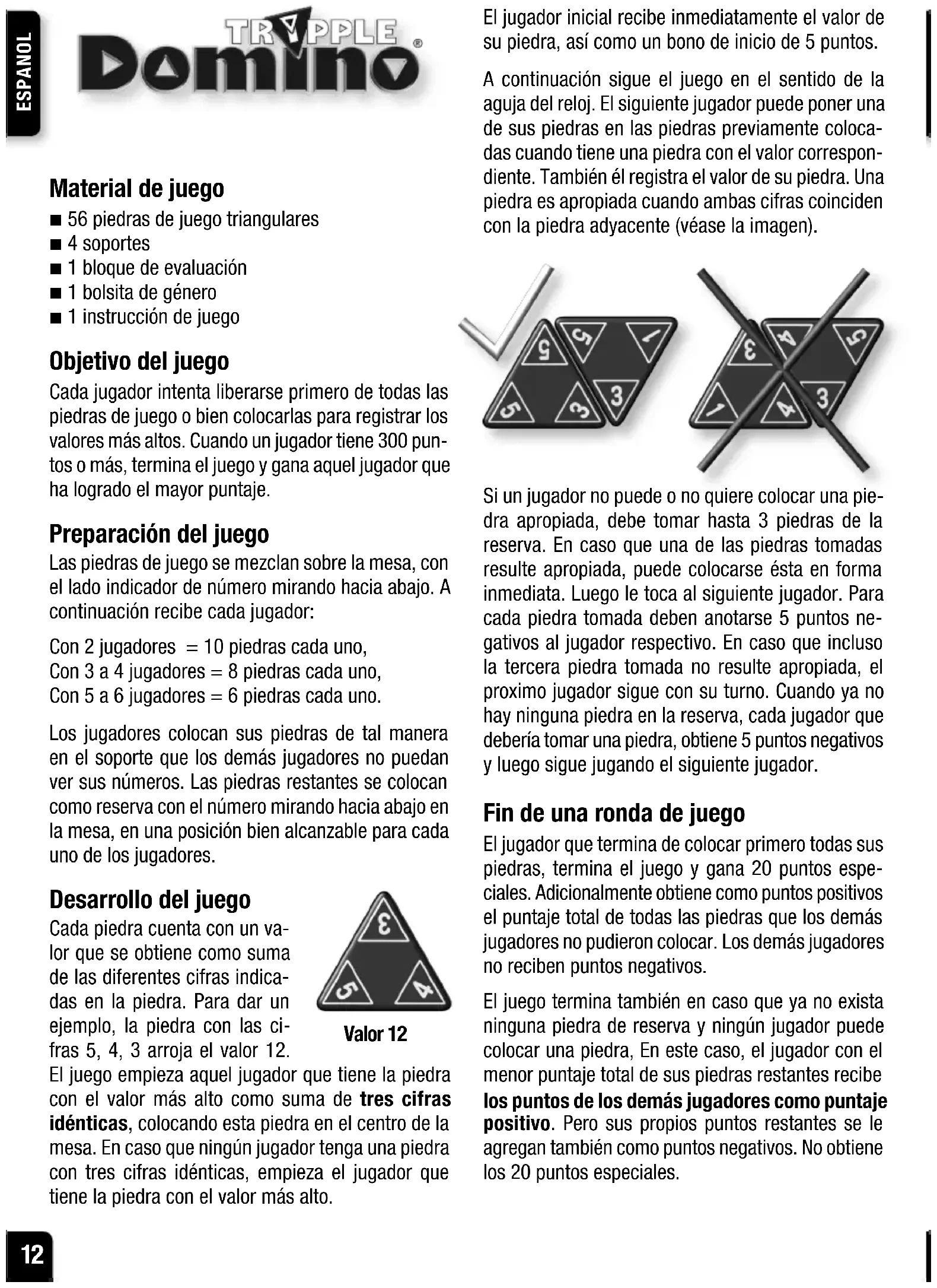 1 instrucción de juego Objetivo del juego Cada jugador intenta liberarse primero de todas las piedras de juego o bien colocarlas para registrar los valores más altos. Cuando un jugador tiene 300 pun- tos o más, termina el juego y gana aquel jugador que ha logrado el mayor puntaje. Preparación del juego Las piedras de juego se mezclan sobre la mesa, con el lado indicador de número mirando hacia abajo. A continuación recibe cada jugador: Con 2 jugadores = 10 piedras cada uno, Con 3 a 4 jugadores = 8 piedras cada uno, Con 5 a 6 jugadores = 6 piedras cada uno. Los jugadores colocan sus piedras de tal manera en el soporte que los demás jugadores no puedan ver sus números. Las piedras restantes se colocan como reserva con el número mirando hacia abajo en la mesa, en una posición bien alcanzable para cada uno de los jugadores. Desarrollo del juego Cada piedra cuenta con un va- lor que se obtiene como suma de las diferentes cifras indica- das en la piedra. Para dar un ejemplo, la piedra con las ci- fras 5, 4, 3 arroja el valor 12. El juego empieza aquel jugador que tiene la piedra con el valor más alto como suma de tres cifras idénticas, colocando esta piedra en el centro de la mesa. En caso que ningún jugador tenga una piedra con tres cifras idénticas, empieza el jugador que tiene la piedra con el valor más alto. El jugador inicial recibe inmediatamente el valor de su piedra, así como un bono de inicio de 5 puntos. A continuación sigue el juego en el sentido de la aguja del reloj. El siguiente jugador puede poner una de sus piedras en las piedras previamente coloca- das cuando tiene una piedra con el valor correspon- diente. También él registra el valor de su piedra. Una piedra es apropiada cuando ambas cifras coinciden con la piedra adyacente (véase la imagen). Si un jugador no puede o no quiere colocar una pie- dra apropiada, debe tomar hasta 3 piedras de la reserva. En caso que una de las piedras tomadas resulte apropiada, puede colocarse ésta en forma inmediata. Luego le toca al siguiente jugador. Para cada piedra tomada deben anotarse 5 puntos ne- gativos al jugador respectivo. En caso que incluso la tercera piedra tomada no resulte apropiada, el proximo jugador sigue con su turno. Cuando ya no hay ninguna piedra en la reserva, cada jugador que debería tomar una piedra, obtiene 5 puntos negativos y luego sigue jugando el siguiente jugador. Fin de una ronda de juego El jugador que termina de colocar primero todas sus piedras, termina el juego y gana 20 puntos espe- ciales. Adicionalmente obtiene como puntos positivos el puntaje total de todas las piedras que los demás jugadores no pudieron colocar. Los demás jugadores no reciben puntos negativos. El juego termina también en caso que ya no exista ninguna piedra de reserva y ningún jugador puede colocar una piedra, En este caso, el jugador con el menor puntaje total de sus piedras restantes recibe los puntos de los demás jugadores como puntaje positivo. Pero sus propios puntos restantes se le agregan también como puntos negativos. No obtiene los 20 puntos especiales. Valor 12 ESPANOL 49287_Tripple-Domino_Classic-Line_2017-Final.indd 12 28.08.17 17:3513 Fin del juego El juego termina cuando un jugador ha alcanzado 300 o más puntos al final de una ronda. Gana el jugador con el mayor puntaje. Tripple Domino