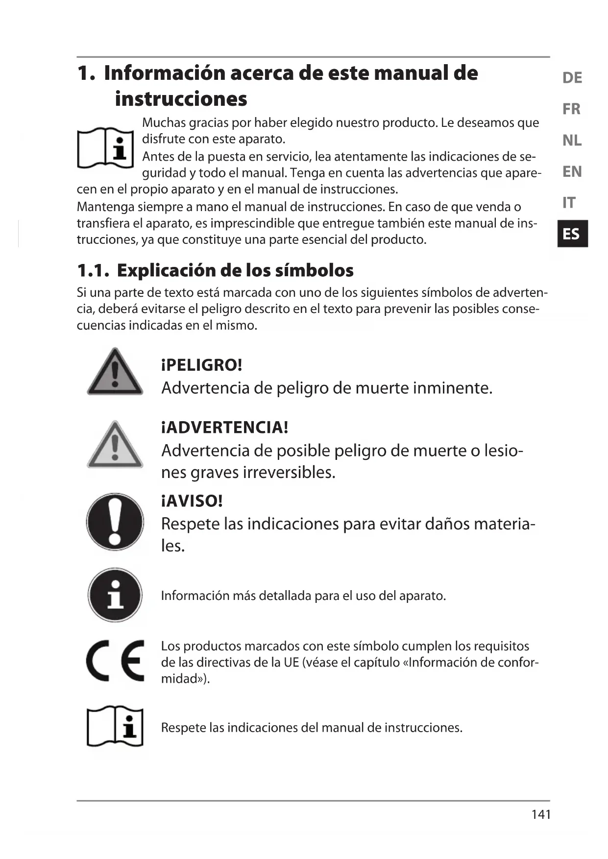 instrucciones Muchas gracias por haber elegido nuestro producto. Le deseamos que disfrute con este aparato. Antes de la puesta en servicio, lea atentamente las indicaciones de se- guridad y todo el manual. Tenga en cuenta las advertencias que apare- cen en el propio aparato y en el manual de instrucciones. Mantenga siempre a mano el manual de instrucciones. En caso de que venda o transfiera el aparato, es imprescindible que entregue también este manual de ins- trucciones, ya que constituye una parte esencial del producto. 1.1. Explicación de los símbolos Si una parte de texto está marcada con uno de los siguientes símbolos de adverten- cia, deberá evitarse el peligro descrito en el texto para prevenir las posibles conse- cuencias indicadas en el mismo. ¡PELIGRO! Advertencia de peligro de muerte inminente. ¡ADVERTENCIA! Advertencia de posible peligro de muerte o lesio- nes graves irreversibles. ¡AVISO! Respete las indicaciones para evitar daños materia- les. Información más detallada para el uso del aparato. Los productos marcados con este símbolo cumplen los requisitos de las directivas de la UE (véase el capítulo «Información de confor- midad»). Respete las indicaciones del manual de instrucciones.142 Clase de protección II Los aparatos eléctricos de la clase de protecciónII son aparatos que disponen de un aislamiento doble o reforzado continuo y que no tienen posibilidad de conexión de un conductor de puesta a tierra. La carcasa de un aparato eléctrico aislado con material aislante de la clase de protecciónII puede constituir total o parcialmente el ais- lamiento adicional o reforzado. Símbolo de corriente continua. Símbolo de corriente alterna. Muestra la posición vertical correcta del embalaje de transporte.