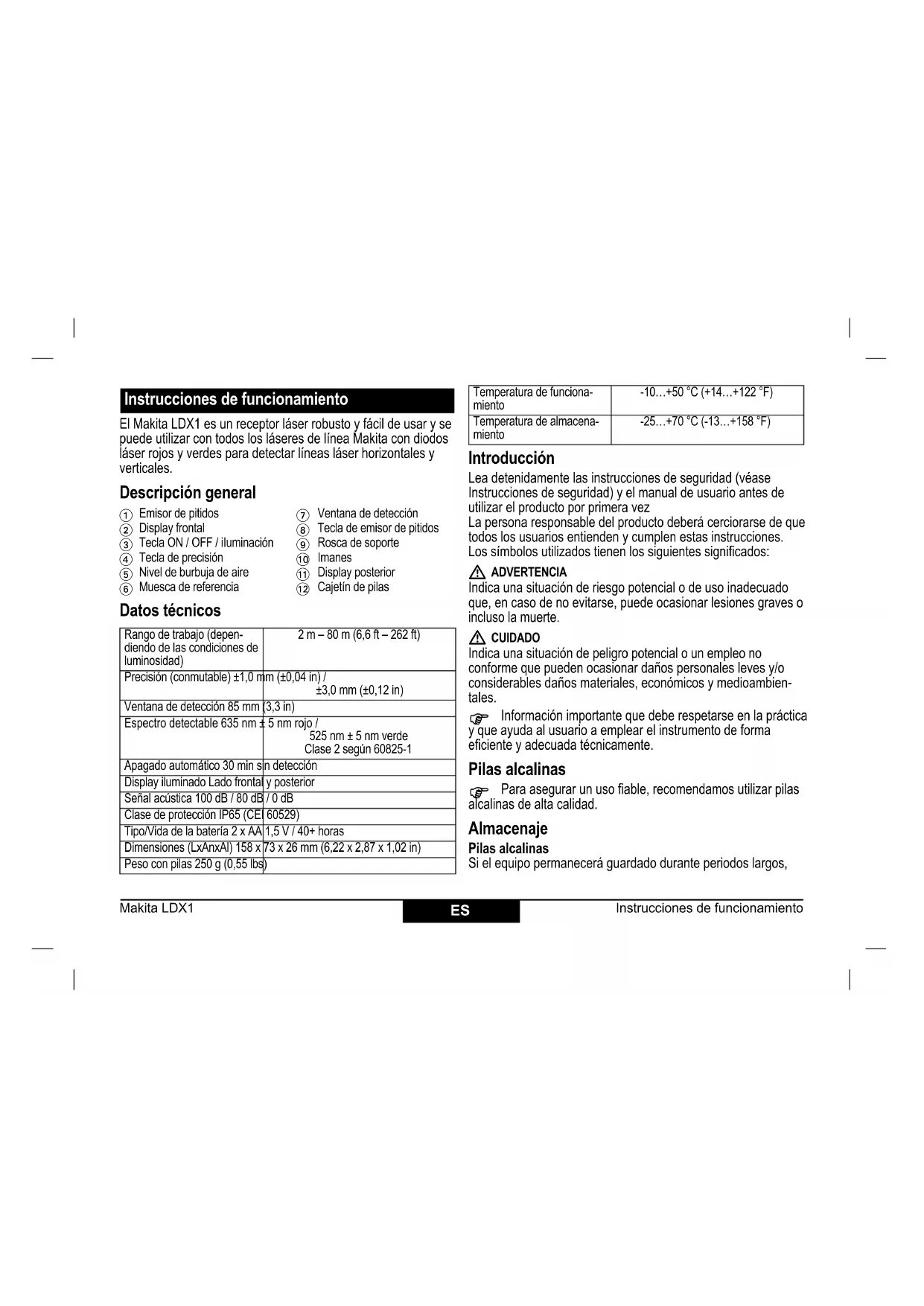 Cajetín de pilas Rango de trabajo (depen- diendo de las condiciones de luminosidad) 2 m – 80 m (6,6 ft – 262 ft) Precisión (conmutable) ±1,0 mm (±0,04 in) / ±3,0 mm (±0,12 in) Ventana de detección 85 mm (3,3 in) Espectro detectable 635 nm ± 5 nm rojo / 525 nm ± 5 nm verde Clase 2 según 60825-1 Apagado automático 30 min sin detección Display iluminado Lado frontal y posterior Señal acústica 100 dB / 80 dB / 0 dB Clase de protección IP65 (CEI 60529) Tipo/Vida de la batería 2 x AA 1,5 V / 40+ horas Dimensiones (LxAnxAl) 158 x 73 x 26 mm (6,22 x 2,87 x 1,02 in) Peso con pilas 250 g (0,55 lbs) Temperatura de funciona- miento -10…+50 °C (+14…+122 °F) Temperatura de almacena- miento -25…+70 °C (-13…+158 °F)ES Makita LDX1