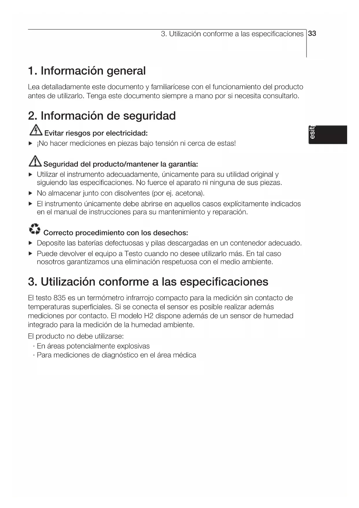 Evitar riesgos por electricidad: ¡No hacer mediciones en piezas bajo tensión ni cerca de estas! Seguridad del producto/mantener la garantía: Utilizar el instrumento adecuadamente, únicamente para su utilidad original y siguiendo las especificaciones. No fuerce el aparato ni ninguna de sus piezas. No almacenar junto con disolventes (por ej. acetona). El instrumento únicamente debe abrirse en aquellos casos explícitamente indicados en el manual de instrucciones para su mantenimiento y reparación. Correcto procedimiento con los desechos: Deposite las baterías defectuosas y pilas descargadas en un contenedor adecuado. Puede devolver el equipo a Testo cuando no desee utilizarlo más. En tal caso nosotros garantizamos una eliminación respetuosa con el medio ambiente.