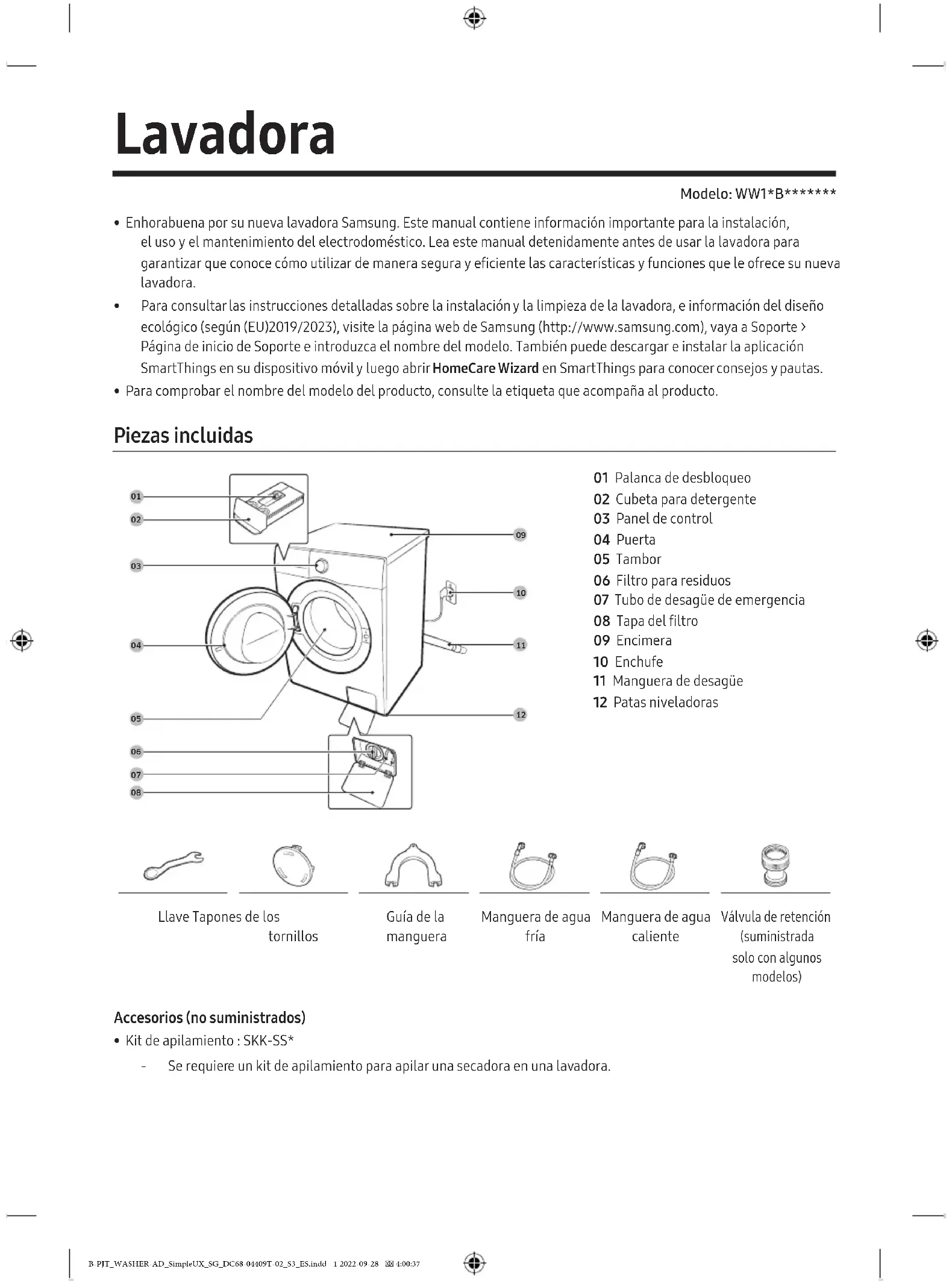 - Kit de apilamiento : SKK-SS* ‐ Se requiere un kit de apilamiento para apilar una secadora en una lavadora. B-PJT_WASHER-AD_SimpleUX_SG_DC68-04409T-02_S3_ES.indd 1 2022-09-28 4:00:37Español2 Información de seguridad NOTA