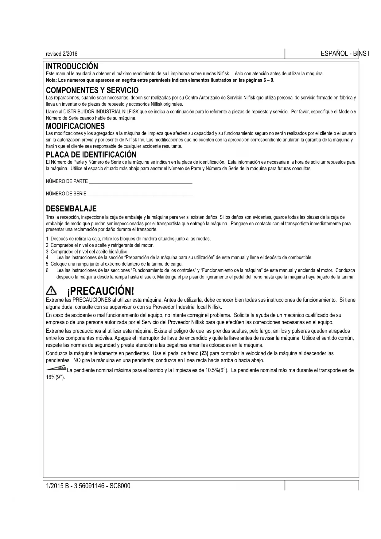 DESEMBALAJE Tras la recepción, inspeccione la caja de embalaje y la máquina para ver si existen daños. Si los daños son evidentes, guarde todas las piezas de la caja de embalaje de modo que puedan ser inspeccionadas por el transportista que entregó la máquina. Póngase en contacto con el transportista inmediatamente para presentar una reclamación por daño durante el transporte. 1 Después de retirar la caja, retire los bloques de madera situados junto a las ruedas. 2 Compruebe el nivel de aceite y refrigerante del motor. 3 Compruebe el nivel del aceite hidráulico. 4 Lea las instrucciones de la sección “Preparación de la máquina para su utilización” de este manual y llene el depósito de combustible. 5 Coloque una rampa junto al extremo delantero de la tarima de carga. 6 Lea las instrucciones de las secciones “Funcionamiento de los controles” y “Funcionamiento de la máquina” de este manual y encienda el motor. Conduzca despacio la máquina desde la rampa hasta el suelo. Mantenga el pie pisando ligeramente el pedal del freno hasta que la máquina haya bajado de la tarima. ¡PRECAUCIÓN! Extreme las PRECAUCIONES al utilizar esta máquina. Antes de utilizarla, debe conocer bien todas sus instrucciones de funcionamiento. Si tiene alguna duda, consulte con su supervisor o con su Proveedor Industrial local Nilfi sk. En caso de accidente o mal funcionamiento del equipo, no intente corregir el problema. Solicite la ayuda de un mecánico cualifi cado de su empresa o de una persona autorizada por el Servicio del Proveedor Nilfi sk para que efectúen las correcciones necesarias en el equipo. Extreme las precauciones al utilizar esta máquina. Existe el peligro de que las prendas sueltas, pelo largo, anillos y pulseras queden atrapados entre los componentes móviles. Apague el interruptor de llave de encendido y quite la llave antes de revisar la máquina. Utilice el sentido común, respete las normas de seguridad y preste atención a las pegatinas amarillas colocadas en la máquina. Conduzca la máquina lentamente en pendientes. Use el pedal de freno (23) para controlar la velocidad de la máquina al descender las pendientes. NO gire la máquina en una pendiente; conduzca en línea recta hacia arriba o hacia abajo. La pendiente nominal máxima para el barrido y la limpieza es de 10.5%(6°). La pendiente nominal máxima durante el transporte es de 16%(9°). revised 2/2016B - 4 SC8000 - 56091146 1/2015