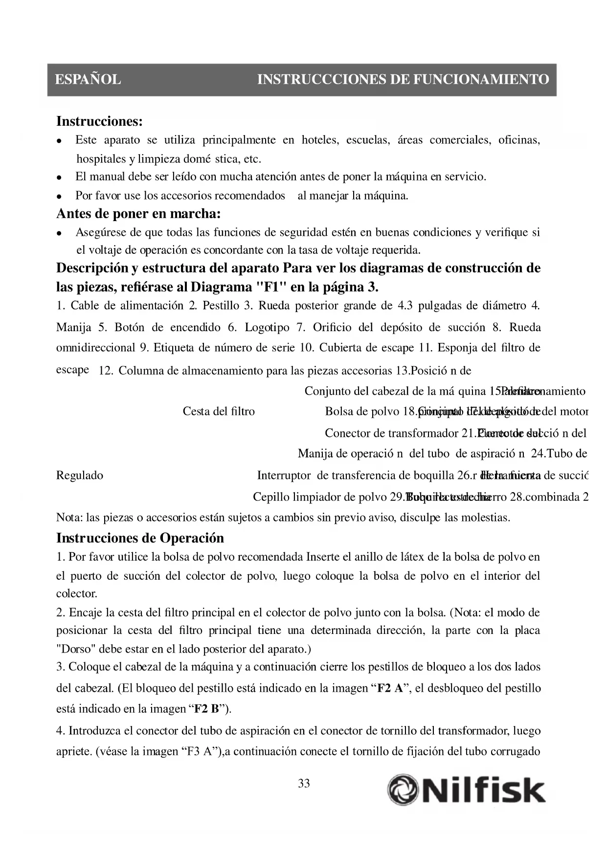 Instrucciones: Este aparato se utiliza principalmente en hoteles, escuelas, áreas comerciales, oficinas, hospitales y limpieza doméstica, etc. El manual debe ser leído con mucha atención antes de poner la máquina en servicio. Por favor use los accesorios recomendados al manejar la máquina. Antes de poner en marcha: Asegúrese de que todas las funciones de seguridad estén en buenas condiciones y verifique si el voltaje de operación es concordante con la tasa de voltaje requerida. Descripción y estructura del aparato Para ver los diagramas de construcción de las piezas, refiérase al Diagrama "F1" en la página 3.