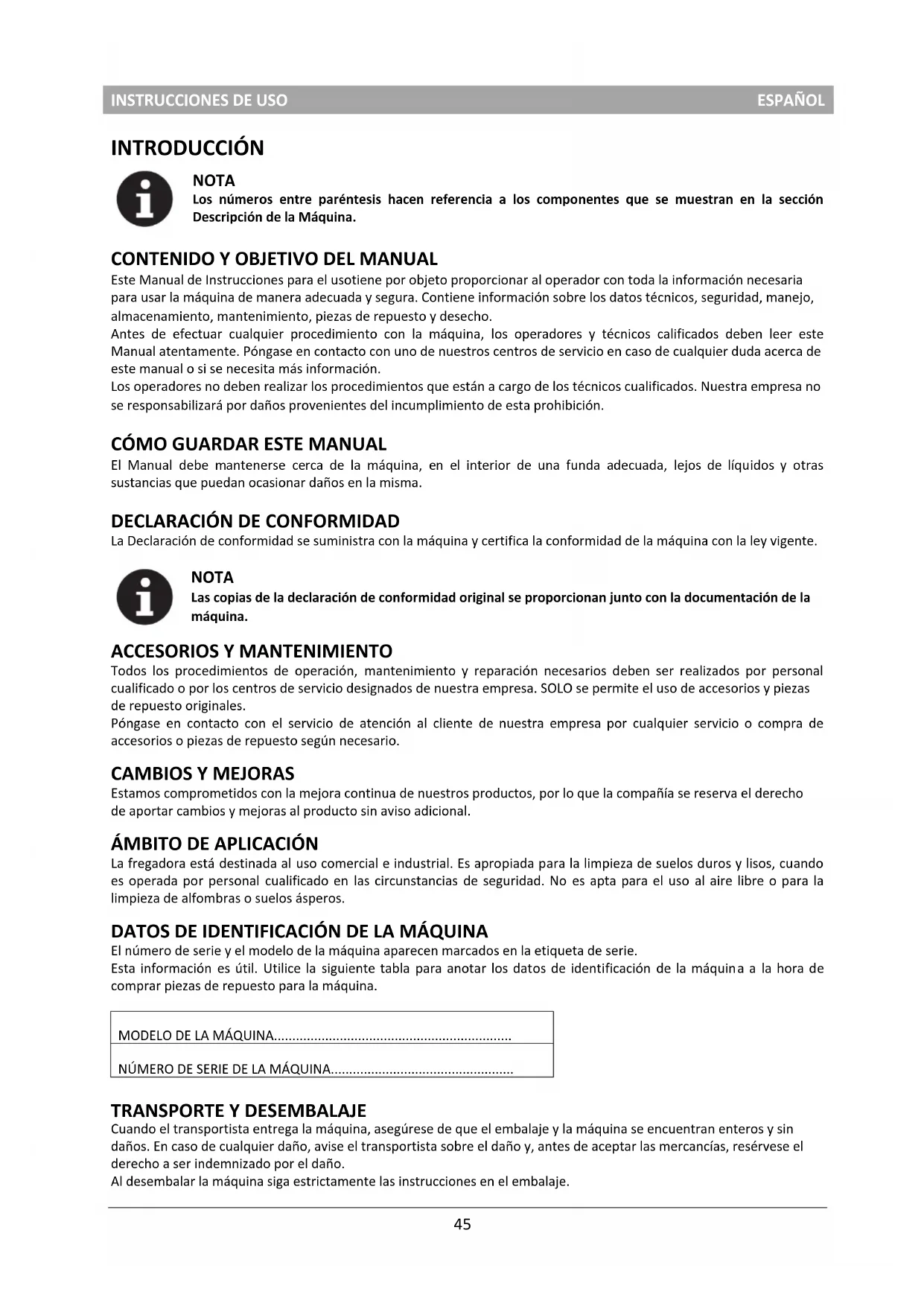 La fregadora está destinada al uso comercial e industrial. Es apropiada para la limpieza de suelos duros y lisos, cuando es operada por personal cualificado en las circunstancias de seguridad. No es apta para el uso al aire libre o para la limpieza de alfombras o suelos ásperos. DATOS DE IDENTIFICACIÓN DE LA MÁQUINA El número de serie y el modelo de la máquina aparecen marcados en la etiqueta de serie. Esta información es útil. Utilice la siguiente tabla para anotar los datos de identificación de la máquina a la hora de comprar piezas de repuesto para la máquina. MODELO DE LA MÁQUINA................................................................. NÚMERO DE SERIE DE LA MÁQUINA..................................................