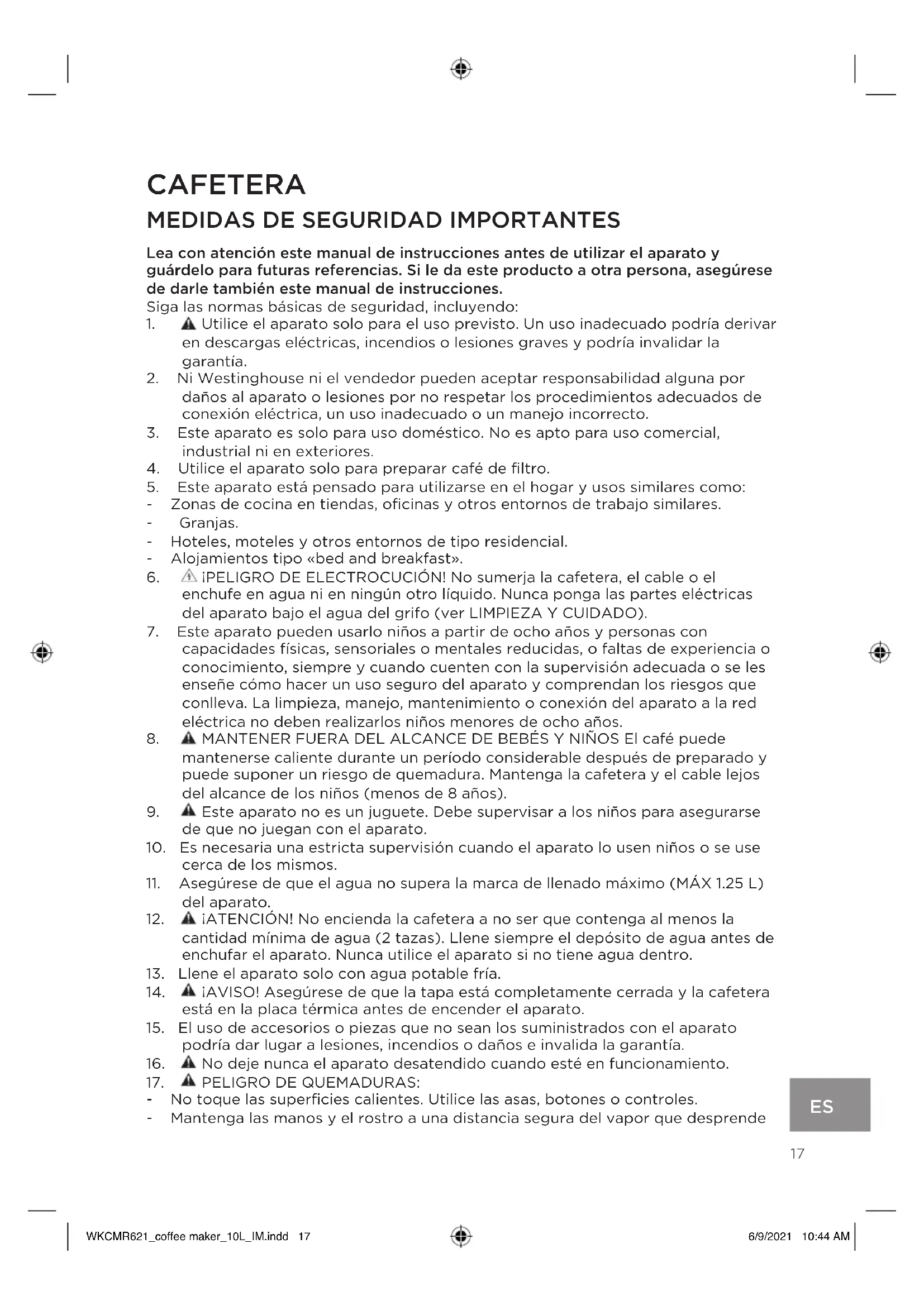 MANTENER FUERA DEL ALCANCE DE BEBÉS Y NIÑOS El café puede mantenerse caliente durante un período considerable después de preparado y puede suponer un riesgo de quemadura. Mantenga la cafetera y el cable lejos del alcance de los niños (menos de 8 años).