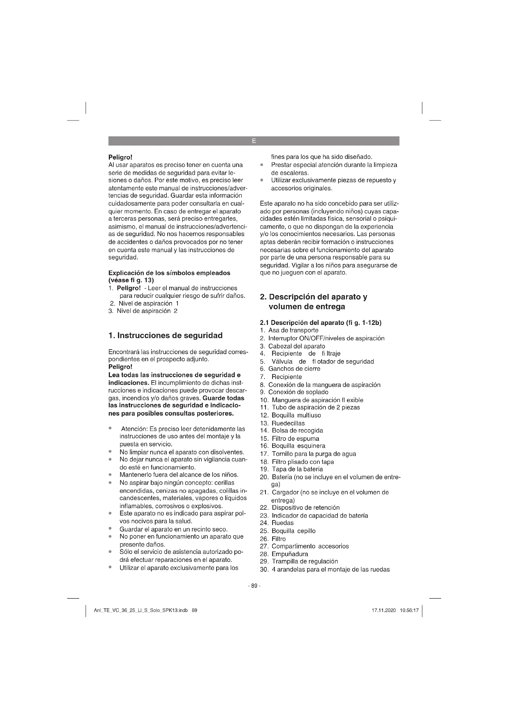 y la batería a nuestro servicio de asistencia técnica. Para realizar un envío adecuado, ponerse en contacto con nuestro servicio de asistencia técnica o con el punto de venta en el que se compró el aparato. Para el envío o la eliminación de baterías o del aparato, estos deben embalarse por separado en bolsas de plástico para evitar cortocircuitos e incendios. Es preciso recargar siempre a tiempo la batería para procurar que dure lo máximo posible. Ha- Anl_TE_VC_36_25_Li_S_Solo_SPK13.indb 91Anl_TE_VC_36_25_Li_S_Solo_SPK13.indb 91 17.11.2020 10:56:1817.11.2020 10:56:18E