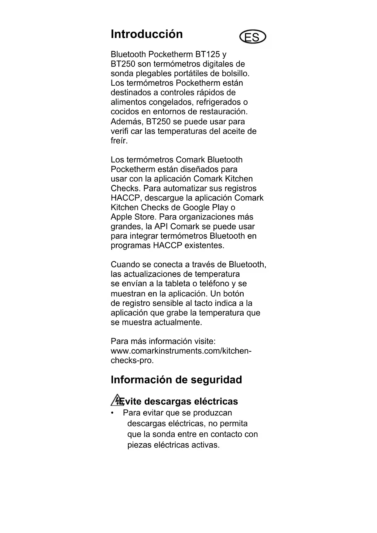 - Deseche las baterías usadas en las instalaciones correspondientes de reciclaje local.Advertencia de seguridad de la FCC Este dispositivo cumple con la Parte 15 de las Reglas de la FCC. La operación está sujeta a las siguientes dos condiciones: (1) Este dispositivo no puede causar interferencia dañina, y (2) Este dispositivo debe aceptar cualquier interferencia recibida, incluidas las interferencias que puedan causar un funcionamiento no deseado. Funcionamiento Encendido/apagado Gire la sonda hacia fuera para activar el termómetro. Gire la sonda hacia dentro para desconectarlo. Encaje la punta detrás del dispositivo de retención para evitar lesiones o daños en la ropa. Al encender, el receptor Bluetooth esperará para establecer conexión durante 60 segundos; si tras este tiempo no se establece una conexión correcta, el receptor Bluetooth se apagará, dejando activo solo el termómetro. Para volver a intentar realizar una conexión Bluetooth, repliegue la sonda a fi n de apagar el termómetro y, a continuación, gírela hacia fuera de nuevo para encender el dispositivo. El termómetro se apagará automáticamente después de 10 minutos para preservar la vida útil de la batería. Pliegue y, a continuación, extienda la sonda para seguir utilizándola. Indicación de batería baja La batería baja se indica mediante un símbolo de batería descargada queaparece en la esquina superior izquierda de la pantalla. Sustituya la batería lo antes posible cuando aparezca este símbolo.Si el nivel de la batería es demasiadobajo, se muestra brevemente la palabra “BATT” antes de que el instrumento se apague solo. Conexión a Comark Kitchen Checks Para conectar el termómetro Bluetooth Pocketherm a Comark Kitchen Checks, siga lasinstrucciones proporcionadas con la aplicación. Cuando se ha conectado correctamente a una aplicación, el LED de actividad azul de la parte delantera del termómetro Bluetooth Pocketherm parpadeará una vez por segundo para indicar que la comunicación está en curso. Para desconectar, basta con plegar la sonda para apagar el Pocketherm, o salir de la aplicación. Realización de mediciones Tras haber conectado el termómetro Bluetooth Pocketherm correctamente a Comark Kitchen Checks, compruebe que el indicador de actividad azul parpadea. Introduzca la punta de la sonda aproximadamente 20 mm (3/4 pulg.) en el alimento que desea comprobar. Deje pasar unos segundos para que la sonda alcance una temperatura estable. Para registrar la lectura toque el botón de grabación de la parte derecha de la pantalla. El termómetro Bluetooth Pocketherm emitirá una señal acústica para confi rmar la pulsación y el indicador de actividad azul se iluminará. En el manual de la aplicación se detalla cómo registrar latemperatura y se notifi ca cualquier límite de temperatura existente. Nota: Si coloca el termómetro Bluetooth Pocketherm boca abajo sobre una superfi cie metálica este puede registrar lecturas de temperaturas no deseadas. Para evitarlo, adopte cualquiera de las medidas siguientes: (a) Coloque el termómetro solo boca arriba sobre las superfi cies metálicas. (b) Asegúrese de que la aplicación no está en modo de grabación, o ciérrela. (c) Apague el termómetro Pocketherm después de cada uso. Mantenimiento Limpieza Para mantener la higiene de la sonda, límpiela regularmente con toallitas para sondas Comark. El instrumento es impermeable y se puede lavar bajo el grifo, pero debe sumergirse. Utilice únicamente limpiadores de cocina domésticos o detergentes suaves para limpiar el instrumento. No utilice productos químicos agresivos ni disolventes, pues pueden atacar a los materiales plásticos y provocar daños. Sustitución de la batería Para sustituir la batería, al principio cierre la sonda después retire los tornillos de fi jación de la tapa de la batería en la parte posterior del instrumento mediante un destornillador plano o Philips.1 Retire las dos celdas y deséchelas en unas instalaciones locales de reciclaje. 1 Destornillador Philips n.º 1 o plano de 5 mm.Sustitúyalas sólo por pilas alcalinas AA y tenga en cuenta la polaridad correcta. Compruebe visualmente que el compartimento de la batería y su tapa estén limpios y libres de residuos. Compruebe que la junta del compartimento de la batería no se haya desplazado de la ranura correspondiente antes de volver a colocar la tapa. Tenga cuidado de no apretar en exceso los tornillos al colocar la tapa. Si aparece “OTA” en la pantalla, simplemente cierre y vuelva a abrir la sonda antes de usarla. Asistencia técnica Por favor, consulte: www.comarkinstruments.com o www.comarkUSA.com para obtener más detalles. Garantía Garantizamos que este producto de Comark Instruments no presentará defectos de material ni de mano de obra durante dos años a partir de la fecha de compra y que esta garantía tiene validez a nivel mundial. La presente garantía no cubre los fusibles, las baterías desechables ni los daños producidos como consecuencia de accidentes, negligencias, usos indebidos o condiciones anómalas de funcionamiento o manipulación. Para obtener servicio durante el período de garantía, visite la página de servicio y reparación de nuestro sitio web: www.comarkinstruments.com o www.comarkUSA.com en la que encontrará instrucciones para obtener una autorización de devolución de material (RMA); a continuación, envíe el producto a nuestro centro de servicio con una descripción del problema.Introduzione Bluetooth Pocketherm BT125 e BT250 sono termometri digitali a sbalzo portatile impermeabili a tasca. I termometri Pocketherm sono destinati per verifi care rapidamente gli alimenti congelati, refrigerati o cotti in ambienti di ristorazione. Inoltre BT250 può essere utilizzato per controllare le temperature dell’olio di frittura. I termometri Comark Bluetooth Pocketherm sono progettati per essere utilizzati con l’App. Comark Kitchen Checks. Per automatizzare i tuoi record HAC