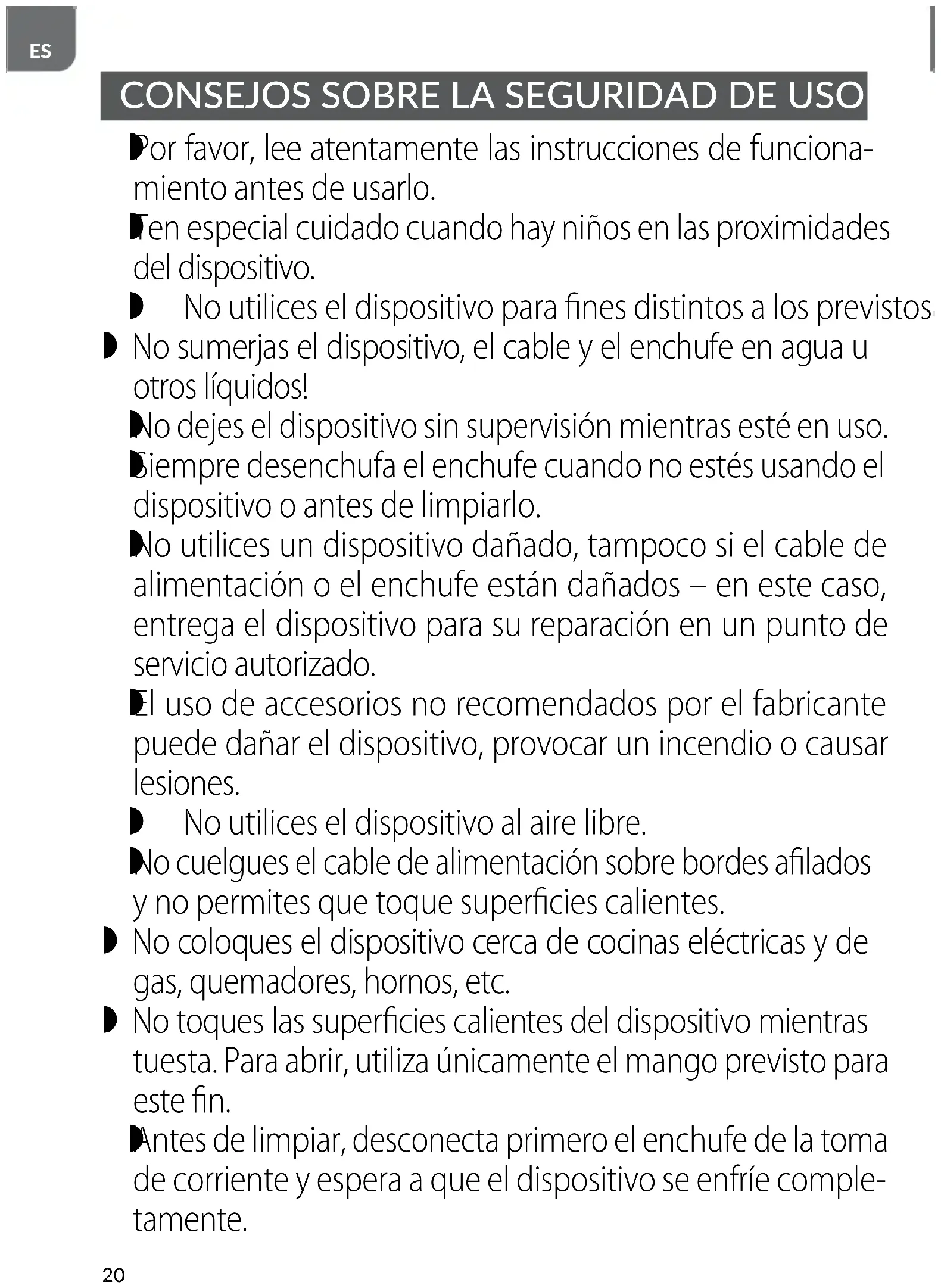No cuelgues el cable de alimentación sobre bordes afilados y no permites que toque superficies calientes. No coloques el dispositivo cerca de cocinas eléctricas y de gas, quemadores, hornos, etc. No toques las superficies calientes del dispositivo mientras tuesta. Para abrir, utiliza únicamente el mango previsto para este fin.