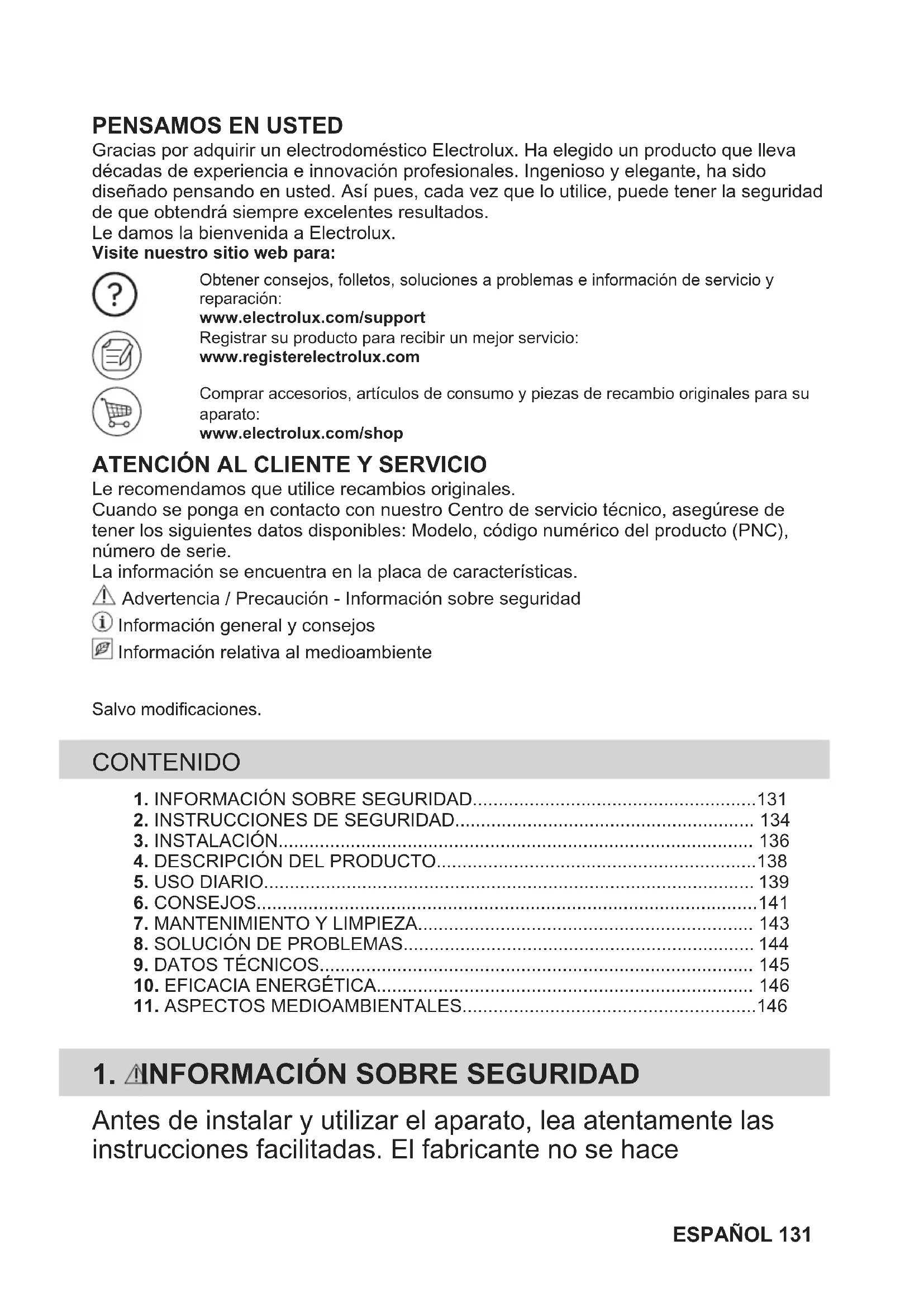 Le recomendamos que utilice recambios originales.Cuando se ponga en contacto con nuestro Centro de servicio técnico, asegúrese detener los siguientes datos disponibles: Modelo, código numérico del producto (PNC),número de serie.La información se encuentra en la placa de características. Advertencia / Precaución - Información sobre seguridad Información general y consejos Información relativa al medioambienteSalvo modificaciones. CONTENIDO 1. INFORMACIÓN SOBRE SEGURIDAD.......................................................1312. INSTRUCCIONES DE SEGURIDAD.......................................................... 134