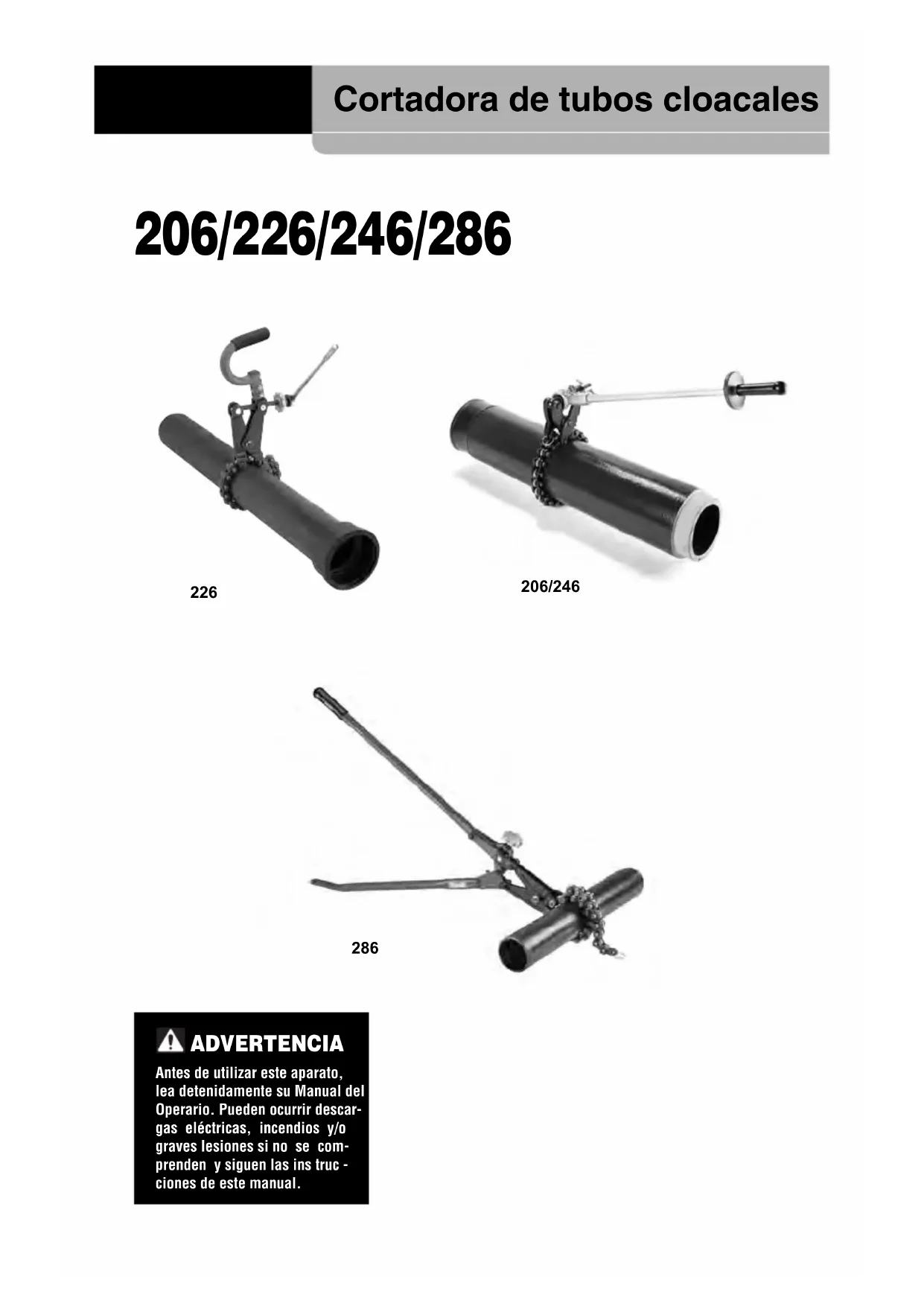 16206/226/246/286 Cortadora de tubos cloacales ADVERTENCIA Antes de utilizar este aparato, lea detenidamente su Manual del Operario. Pueden ocurrir descar- gas eléctricas, incendios y/o graves lesiones si no se com- prenden y siguen las ins truc - ciones de este manual.