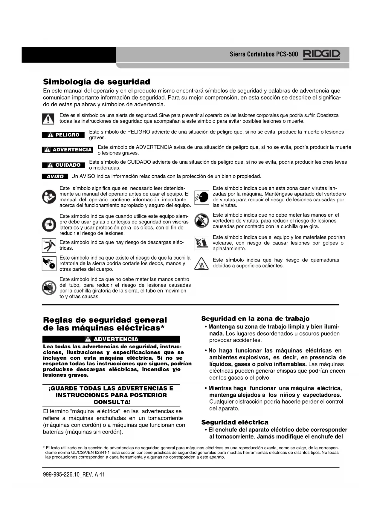 - Almacene las máquinas eléctricas que no estén en uso fuera del alcance de los niños y no permita que las hagan funcionar personas que no estén familiarizadas con este aparato o no hayan leído estas instrucciones de operación. Las máquinas eléctricas son peligrosas en manos de personas no capacitadas.999-995-226.10_REV. A 43 Sierra Cortatubos PCS-500 movimiento por completo antes de manipular el aparato o el tubo. Esto reduce el riesgo de sufrir lesiones cortantes o por enmarañamiento.
