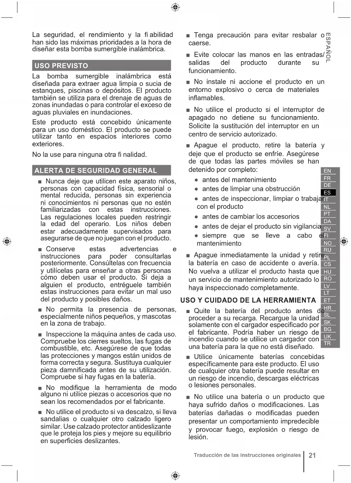 La seguridad, el rendimiento y la fi abilidad han sido las máximas prioridades a la hora de diseñar esta bomba sumergible inalámbrica. USO PREVISTO La bomba sumergible inalámbrica está diseñada para extraer agua limpia o sucia de estanques, piscinas o depósitos. El producto también se utiliza para el drenaje de aguas de zonas inundadas o para controlar el exceso de aguas pluviales en inundaciones. Este producto está concebido únicamente para un uso doméstico. El producto se puede utilizar tanto en espacios interiores como exteriores. No la use para ninguna otra fi nalidad.