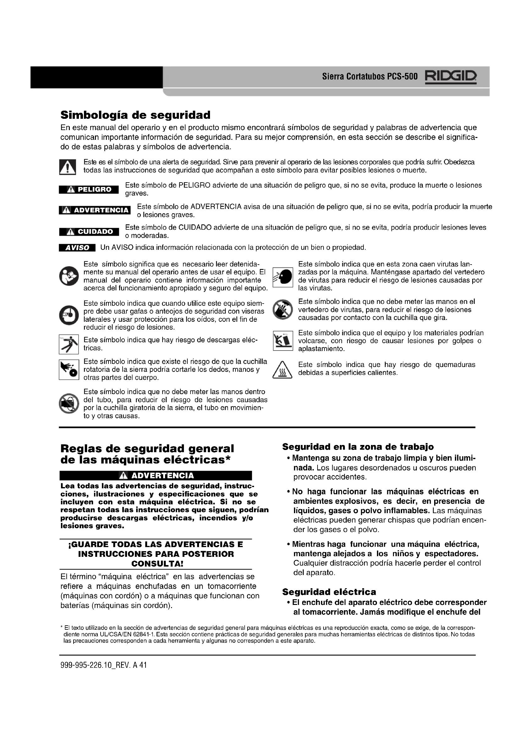 - Encomiende el servicio de la máquina eléctrica únicamente a técnicos calificados que usen re - puestos idénticos a las piezas originales. Así se garantiza la continua seguridad de la máquina eléctri- ca. Información de seguridad especíca ADVERTENCIA Esta sección contiene información de seguridad importante que es especíca para esta herramienta. Antes de utilizar la sierra cortatubos transportable PCS-500, lea estas instrucciones detenidamente para reducir el riesgo de choque de electricidad o de otras lesiones graves.