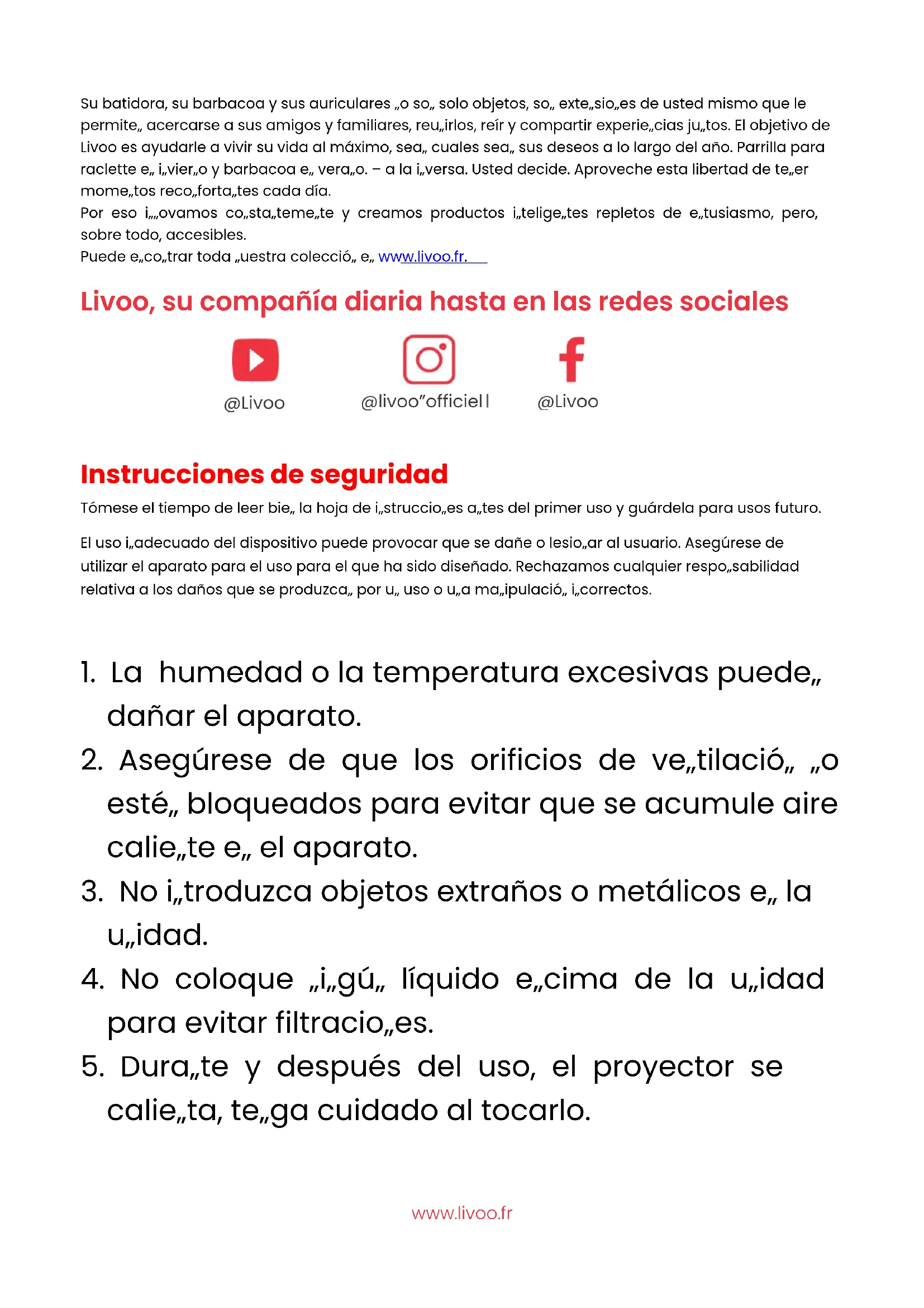 Gracias por elegir un producto Livoo! ESwww.livoo.fr Su batidora, su barbacoa y sus auriculares no son solo objetos, son extensiones de usted mismo que le permiten acercarse a sus amigos y familiares, reunirlos, reír y compartir experiencias juntos. El objetivo de Livoo es ayudarle a vivir su vida al máximo, sean cuales sean sus deseos a lo largo del año. Parrilla para raclette en invierno y barbacoa en verano. O a la inversa. Usted decide. Aproveche esta libertad de tener momentos reconfortantes cada día. Por eso innovamos constantemente y creamos productos inteligentes repletos de entusiasmo, pero, sobre todo, accesibles. Puede encontrar toda nuestra colección en www.livoo.fr. Livoo, su compañía diaria hasta en las redes sociales