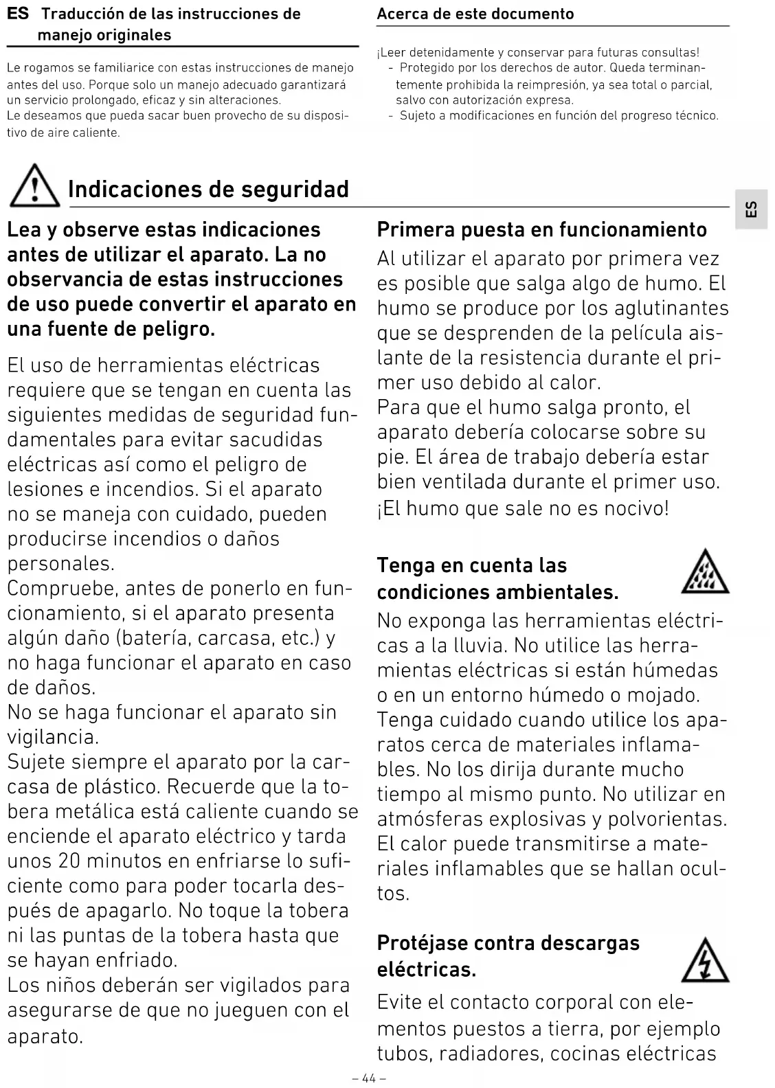 ANNI DEL PRODUTTOREES – 44 – Lea y observe estas indicaciones antes de utilizar el aparato. La no observancia de estas instrucciones de uso puede convertir el aparato en una fuente de peligro. El uso de herramientas eléctricas requiere que se tengan en cuenta las siguientes medidas de seguridad fun- damentales para evitar sacudidas eléctricas así como el peligro de lesiones e incendios. Si el aparato no se maneja con cuidado, pueden producirse incendios o daños personales. Compruebe, antes de ponerlo en fun- cionamiento, si el aparato presenta algún daño (batería, carcasa, etc.) y no haga funcionar el aparato en caso de daños. No se haga funcionar el aparato sin vigilancia. Sujete siempre el aparato por la car- casa de plástico. Recuerde que la to- bera metálica está caliente cuando se enciende el aparato eléctrico y tarda unos 20 minutos en enfriarse lo sufi- ciente como para poder tocarla des- pués de apagarlo. No toque la tobera ni las puntas de la tobera hasta que se hayan enfriado. Los niños deberán ser vigilados para asegurarse de que no jueguen con el aparato. Primera puesta en funcionamiento Al utilizar el aparato por primera vez es posible que salga algo de humo. El humo se produce por los aglutinantes que se desprenden de la película ais- lante de la resistencia durante el pri- mer uso debido al calor. Para que el humo salga pronto, el aparato debería colocarse sobre su pie. El área de trabajo debería estar bien ventilada durante el primer uso. ¡El humo que sale no es nocivo! Tenga en cuenta las condiciones ambientales. No exponga las herramientas eléctri- cas a la lluvia. No utilice las herra- mientas eléctricas si están húmedas o en un entorno húmedo o mojado. Tenga cuidado cuando utilice los apa- ratos cerca de materiales inflama- bles. No los dirija durante mucho tiempo al mismo punto. No utilizar en atmósferas explosivas y polvorientas. El calor puede transmitirse a mate- riales inflamables que se hallan ocul- tos. Protéjase contra descargas eléctricas. Evite el contacto corporal con ele- mentos puestos a tierra, por ejemplo tubos, radiadores, cocinas eléctricas Indicaciones de seguridad ES Traducción de las instrucciones de manejo originales Le rogamos se familiarice con estas instrucciones de manejo antes del uso. Porque solo un manejo adecuado garantizará un servicio prolongado, eficaz y sin alteraciones. Le deseamos que pueda sacar buen provecho de su disposi- tivo de aire caliente. Acerca de este documento ¡Leer detenidamente y conservar para futuras consultas! - Protegido por los derechos de autor. Queda terminan- temente prohibida la reimpresión, ya sea total o parcial, salvo con autorización expresa. - Sujeto a modificaciones en función del progreso técnico.ES – 44 – – 45 – o frigoríficos. No deje el aparato sin vigilancia mientras esté en funciona- miento. No deje el aparato sin vigilancia mientras esté en funcionamiento. La herramienta eléctrica debe colo- carse siempre en una posición se- gura. Guarde sus herramientas en un sitio seguro. Después de usarlo, coloque el aparato sobre su pie y deje que se enfríe antes de volver a guardarlo. Las he- rramientas fuera de uso se han de guardar en un sitio seco y cerrado, fuera del alcance de los niños. Este aparato puede ser utilizado por niños a partir de los 8 años y por per- sonas con capacidades físicas, senso- riales o mentales reducidas o por personas con falta de experiencia y conocimientos si están bajo supervi- sión o han sido instruidos acerca de un uso seguro del aparato y com- prenden los riesgos que puede implicar. Los niños no deben jugar con el aparato. La limpieza y el mantenimiento del usuario no deberán ser llevados a cabo por niños sin la debida vigilancia. Condiciones de seguridad laboral y equipo de protección personal ¡Cuidado con dispositivos u objetos que puedan caerse! Asegúrese de que dispositivos u objetos no puedan caerse encima de las personas. Póngase su equipo de protección per- sonal. Use guantes protectores, protección ocular o respiratoria según la aplicación. Preste atención a los gases tóxicos y al peligro de inflamación. Al trabajar plásticos, lacas y materia- les similares, pueden producirse gases tóxicos. Tenga presente el peligro de incendio e inflamación. Para su propia seguridad, utilice únicamente los accesorios y el equipo adicional indicados en estas instruc- ciones de uso, o los recomendados o indicados por el fabricante de la he- rramienta. El uso de herramientas de trabajo o accesorios no recomenda- dos en las instrucciones de uso o en el catálogo puede implicar para usted el riesgo de lesiones personales. Las reparaciones solo las deberá realizar un técnico electricista. Esta herramienta eléctrica cumple las normas de seguridad pertinentes. Su reparación solo deberá llevarla a cabo un técnico electricista cualifi- cado, ya que el usuario, de lo contra- rio, podría sufrir accidentes. Indicaciones de seguridadES – 46 – Batería recargable ■ Proteja la batería recargable y el aparato del calor, la humedad, el agua, p. ej., también de una cons- tante exposición al sol y al fuego. ¡Existe peligro de explosión! ■ La batería recargable solo puede extraerse conforme a estas ins- trucciones. ■ No abra el aparato ni la batería. Existe peligro de cortocircuito. En caso de problemas, diríjase a su punto de venta. ■ No toque el líquido electrolítico que se haya derramado. Evite el con- tacto con los ojos. Retire el aparato de inmediato de las fuentes de calor o de llamas abiertas. Quítese de inmediato las prendas de ropa contaminadas. ■ Si sale electrolito de la batería, habrá que tomar las siguientes medidas: Contacto con los ojos Lávese de inmediato los ojos abun- dantemente con agua limpia sin frotar, p. ej., con agua del grifo. Consulte a un médico. No tomar las correspondientes medidas, podrá im- plicar una pérdida de la capacidad visual. Contacto con la piel Láv