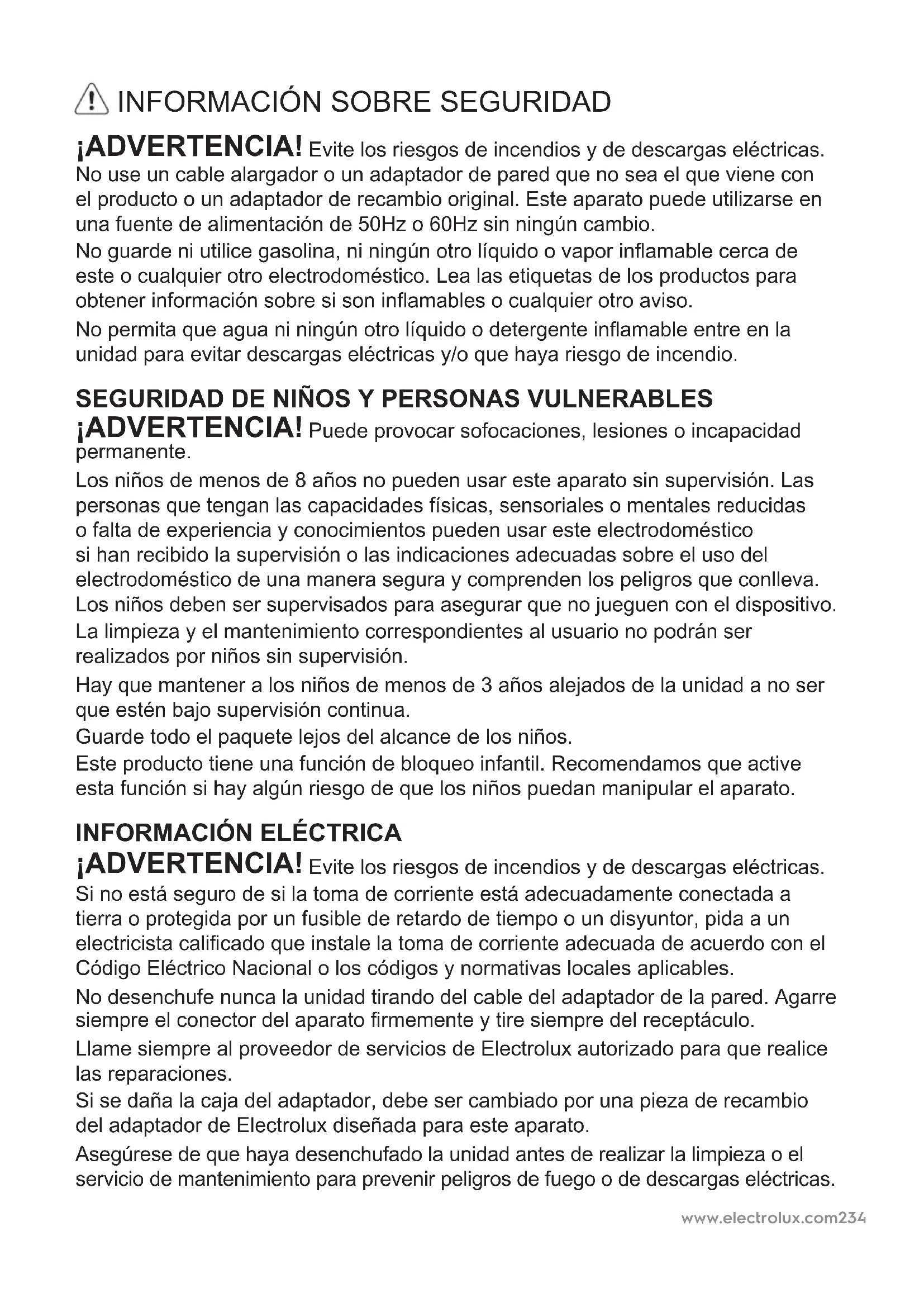 ¡ADVERTENCIA! Evite los riesgos de incendios y de descargas eléctricas. Si no está seguro de si la toma de corriente está adecuadamente conectada a tierra o protegida por un fusible de retardo de tiempo o un disyuntor, pida a un electricista calicado que instale la toma de corriente adecuada de acuerdo con el Código Eléctrico Nacional o los códigos y normativas locales aplicables. No desenchufe nunca la unidad tirando del cable del adaptador de la pared. Agarre siempre el conector del aparato rmemente y tire siempre del receptáculo. Llame siempre al proveedor de servicios de Electrolux autorizado para que realice las reparaciones. Si se daña la caja del adaptador, debe ser cambiado por una pieza de recambio del adaptador de Electrolux diseñada para este aparato. Asegúrese de que haya desenchufado la unidad antes de realizar la limpieza o el servicio de mantenimiento para prevenir peligros de fuego o de descargas eléctricas.www.electrolux.com 235