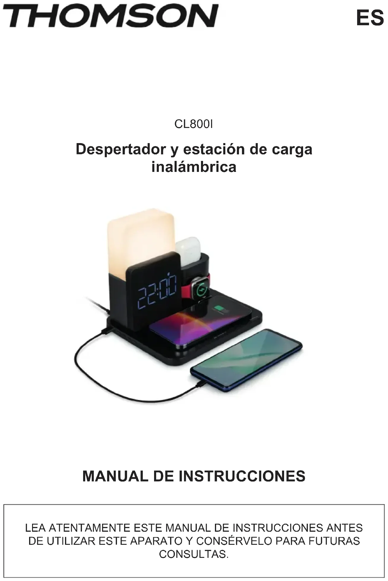 blanco. ADVERTENCIA: no colocar piezas y/u objetos metálicos sobre la placa de carga inalámbrica para evitar cualquier efecto de sobrecalentamiento en los objetos metálicos. Instrucciones para el funcionamiento de la lámpara de LED. Tocar 1 vez para encender la luz blanca cálida. 2 veces para la luz blanca fría. 3 veces para la luz blanca brillante. Tocar 4 veces para apagar la luz. Con cualquier color de la luz, mantener pulsado para ajuar la luminosidad. En modo alarma, tocar brevemente para activar Snooze, tocar más tiempo para detener la alarma. En modo Snooze, mantener pulsado para cancelar Snooze.- ES 34 - Aparatos aptos Ee aparato asume una carga inalámbrica rápida, según la norma de carga inalámbrica; realiza una transmisión de alimentación inalámbrica de corta diancia por inducción magnética. Ee aparato puede cargar todos los aparatos de carga inalámbrica que cumplan con la norma. Puntos importantes No utilizar ni almacenar el aparato bajo la luz directa del sol ni a temperaturas elevadas durante un periodo prolongado. No cargar demasiado cerca de tarjetas magnéticas, de soportes de regiro magnético y de inrumentos de precisión. No desmontar ni modicar ee aparato. No tocar el adaptador de corriente con las manos mojadas. Mantener ee aparato alejado del agua u otros líquidos. Para limpiar ee aparato, cortar la alimentación eléctrica. Rango de temperaturas del entorno de funcionamiento del aparato: de -20 a 45 °C Especificaciones técnicas Número de modelo: CL800I Alimentación: CC 9 V/2,7 A Ecacia de carga: 75 % Salida inalámbrica: 5 W/7,5 W/10 W Salida USB-A CC 5 V/1 A Salida USB-A CC 5 V/0,75 A (carcasa) Salida USB-C: CC 5 V/0,75 A (carcasa) Batería de emergencia del despertador: 1 x CR2032 3 V Dimensiones del producto: 202 x 170 x 174 mm- ES 35 - Protección del medio ambiente El producto ha sido diseñado y fabricado con materiales y componentes de alta calidad que pueden reciclarse y reutilizarse. Se deben señalar los aspectos medioambientales de la eliminación de las baterías. Cuando el símbolo de un contenedor de basura con ruedas tachado se encuentra en un producto, indica que ée eá regulado por la directiva europea 2002/96/CE. Consulte a las autoridades pertinentes para informarse acerca del siema local de recogida selectiva de basuras para productos eléctricos y electrónicos. Proceda según la normativa local y no deseche sus productos antiguos con los residuos doméicos. Al realizar la eliminación de ee producto, también ayuda a evitar las consecuencias potencialmente negativas para el medio ambiente y la salud humana. Información complementaria