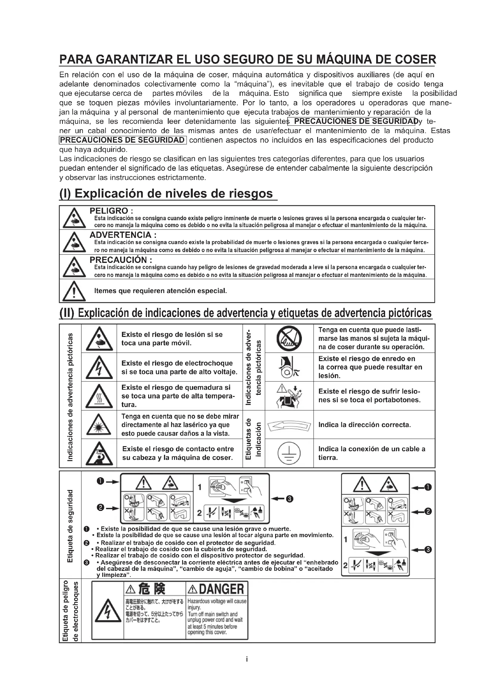 PARA GARANTIZAR EL USO SEGURO DE SU MÁQUINA DE COSER (I) Explicación de niveles de riesgos (II) Explicación de indicaciones de advertencia y etiquetas de advertencia pictóricasii ESPAÑOL