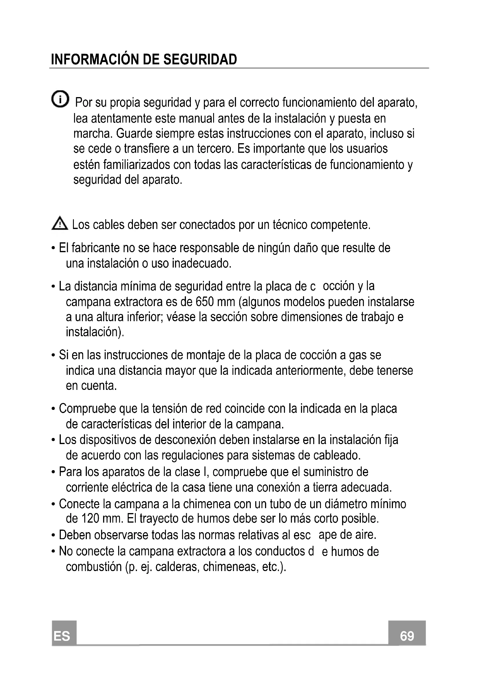 - No conecte la campana extractora a los conductos d e humos de combustión (p. ej. calderas, chimeneas, etc.).ES