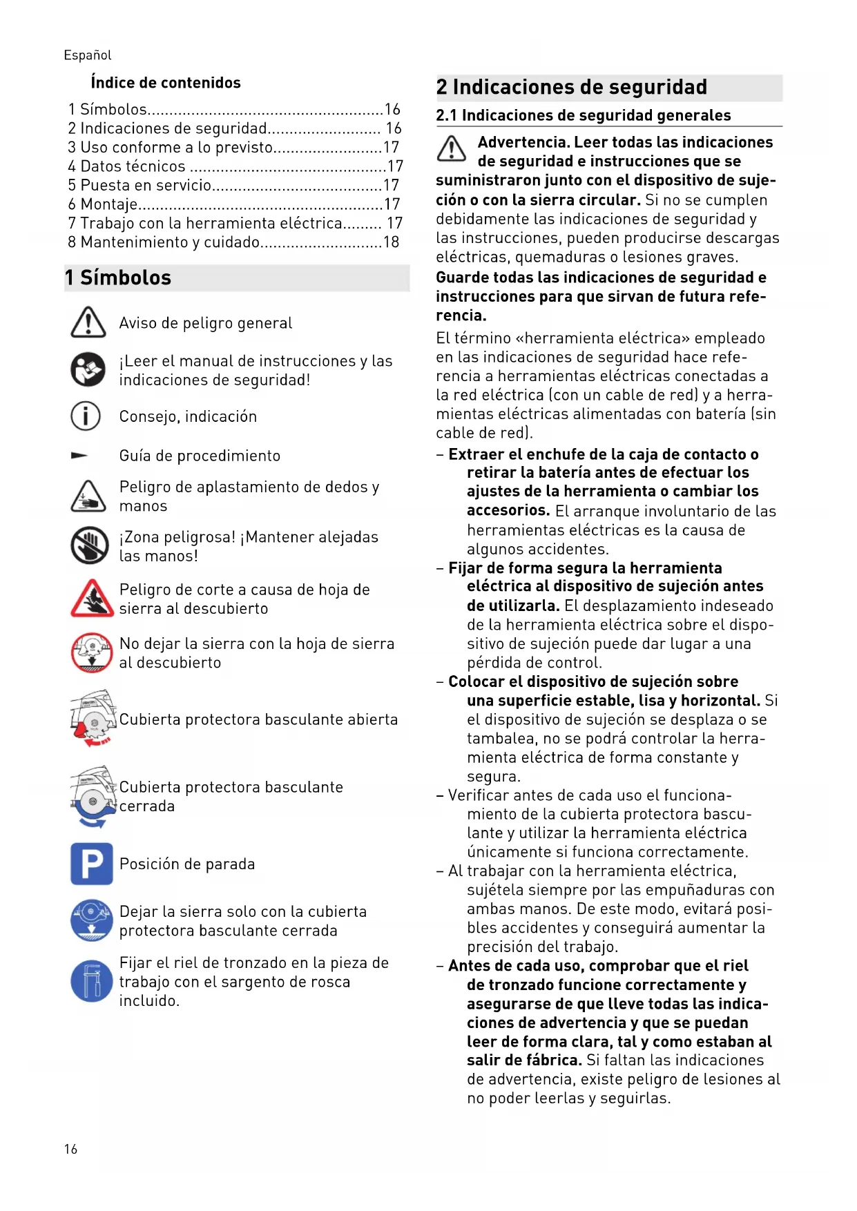 Advertencia. Leer todas las indicaciones de seguridad e instrucciones que se suministraron junto con el dispositivo de suje ción o con la sierra circular. Si no se cumplen debidamente las indicaciones de seguridad y las instrucciones, pueden producirse descargas eléctricas, quemaduras o lesiones graves. Guarde todas las indicaciones de seguridad e instrucciones para que sirvan de futura refe rencia. El término «herramienta eléctrica» empleado en las indicaciones de seguridad hace refe rencia a herramientas eléctricas conectadas a la red eléctrica (con un cable de red) y a herra mientas eléctricas alimentadas con batería (sin cable de red). – Extraer el enchufe de la caja de contacto o retirar la batería antes de efectuar los ajustes de la herramienta o cambiar los accesorios. El arranque involuntario de las herramientas eléctricas es la causa de algunos accidentes. – Fijar de forma segura la herramienta eléctrica al dispositivo de sujeción antes de utilizarla. El desplazamiento indeseado de la herramienta eléctrica sobre el dispo sitivo de sujeción puede dar lugar a una pérdida de control. – Colocar el dispositivo de sujeción sobre una superficie estable, lisa y horizontal. Si el dispositivo de sujeción se desplaza o se tambalea, no se podrá controlar la herra mienta eléctrica de forma constante y segura. – Verificar antes de cada uso el funciona miento de la cubierta protectora bascu lante y utilizar la herramienta eléctrica únicamente si funciona correctamente. – Al trabajar con la herramienta eléctrica, sujétela siempre por las empuñaduras con ambas manos. De este modo, evitará posi bles accidentes y conseguirá aumentar la precisión del trabajo. – Antes de cada uso, comprobar que el riel de tronzado funcione correctamente y asegurarse de que lleve todas las indica ciones de advertencia y que se puedan leer de forma clara, tal y como estaban al salir de fábrica. Si faltan las indicaciones de advertencia, existe peligro de lesiones al no poder leerlas y seguirlas. Español