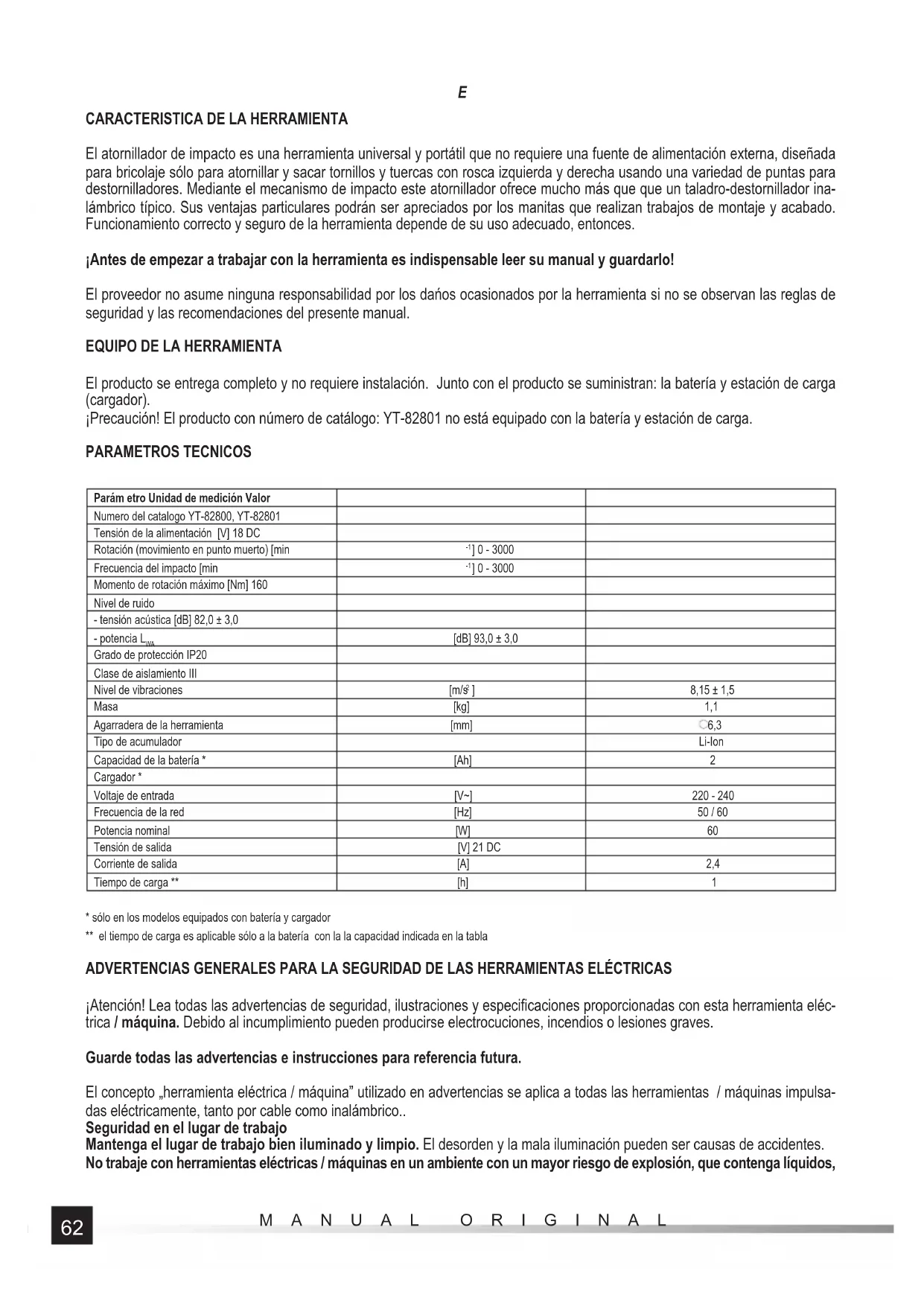 - sólo en los modelos equipados con batería y cargador ** el tiempo de carga es aplicable sólo a la batería con la la capacidad indicada en la tabla ADVERTENCIAS GENERALES PARA LA SEGURIDAD DE LAS HERRAMIENTAS ELÉCTRICAS ¡Atención! Lea todas las advertencias de seguridad, ilustraciones y especifi caciones proporcionadas con esta herramienta eléc- trica / máquina. Debido al incumplimiento pueden producirse electrocuciones, incendios o lesiones graves. Guarde todas las advertencias e instrucciones para referencia futura. El concepto „herramienta eléctrica / máquina” utilizado en advertencias se aplica a todas las herramientas / máquinas impulsa- das eléctricamente, tanto por cable como inalámbrico.. Seguridad en el lugar de trabajo Mantenga el lugar de trabajo bien iluminado y limpio. El desorden y la mala iluminación pueden ser causas de accidentes. No trabaje con herramientas eléctricas / máquinas en un ambiente con un mayor riesgo de explosión, que contenga líquidos,63 MANUAL ORIGINAL