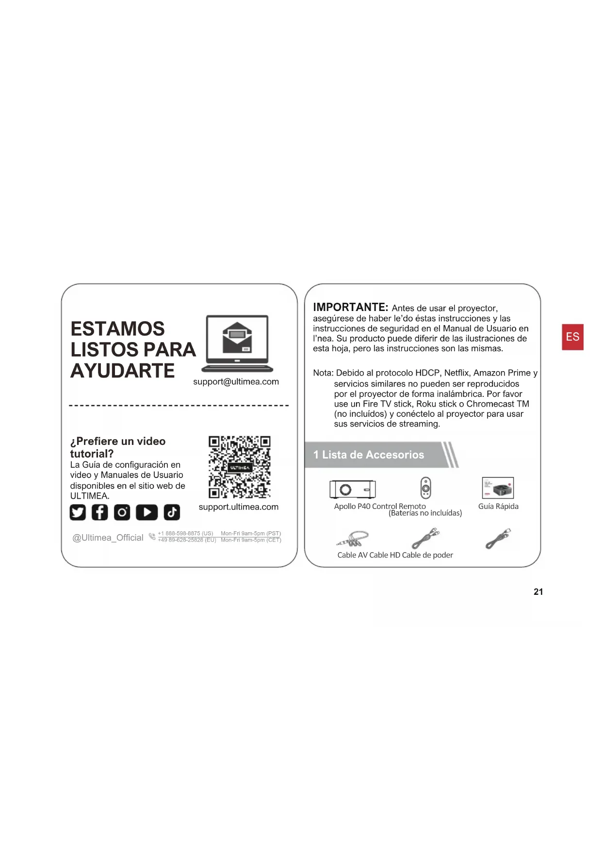 1080P 1 Lista de Accesorios IMPORTANTE: Antes de usar el proyector, asegúrese de haber leído éstas instrucciones y las instrucciones de seguridad en el Manual de Usuario en línea. Su producto puede diferir de las ilustraciones de esta hoja, pero las instrucciones son las mismas. Apollo P40 Control Remoto (Baterías no incluídas) Guía Rápida Cable AV Cable HD Cable de poder Nota: Debido al protocolo HDCP, Netflix, Amazon Prime y servicios similares no pueden ser reproducidos por el proyector de forma inalámbrica. Por favor use un Fire TV stick, Roku stick o Chromecast TM (no incluídos) y conéctelo al proyector para usar sus servicios de streaming. support@ultimea.com ESTAMOS LISTOS PARA AYUDARTE La Guía de conguración en video y Manuales de Usuario disponibles en el sitio web de ULTIMEA. ¿Preere un video tutorial? support.ultimea.com @Ultimea_Official +1 888-598-8875 (US) Mon-Fri 9am-5pm (PST)+49 89-628-25828 (EU) Mon-Fri 9am-5pm (CET)1080P 3 Control Remoto Enfoque- Encendido Atrás Home Mudo VOL- Enfoque+ Fuente Flechas direccionales/OK Menú VOL+ Ajustes 2 Producto Lente Encendido Auto enfoque Alimentación de poder Auxiliar
