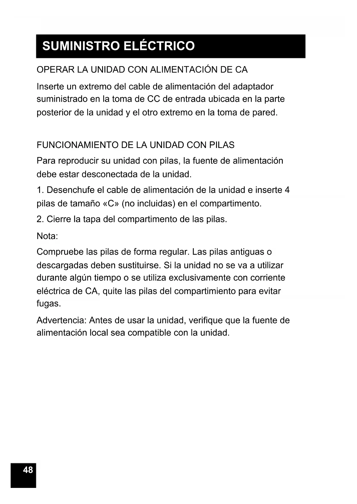 Nota: Compruebe las pilas de forma regular. Las pilas antiguas o descargadas deben sustituirse. Si la unidad no se va a utilizar durante algún tiempo o se utiliza exclusivamente con corriente eléctrica de CA, quite las pilas del compartimiento para evitar fugas. Advertencia:Antesdeusarlaunidad,veriquequelafuentede alimentación local sea compatible con la unidad.49 PRECAUCIONES DE SEGURIDAD DE LAS PILAS: ●Mantengalaspilasalejadasdeniñosymascotas. ●Insertelaspilasrespetandolapolaridadcorrecta(+/-).Noalinear correctamente la polaridad de las pilas puede causar lesiones personales y/o daños materiales. ●Retirelaspilasantiguasodescargadasdelproducto.Retirelas pilas cuando el producto no se vaya a utilizar durante periodos prolongados para evitar los daños causados por pilas oxidadas o corroídas ●Noexpongalaspilasalfuegouotrasfuentesdecalor ●Desechadodelaspilas:Laspilasantiguasodescargadasdeben desecharse o reciclarse adecuadamente cumpliendo con las leyes aplicables. Para obtener información detallada, póngase en contacto con el departamento de residuos. ●Sigalasinstruccionesdeseguridad,usoydesechadodelfabricante de las pilas.50