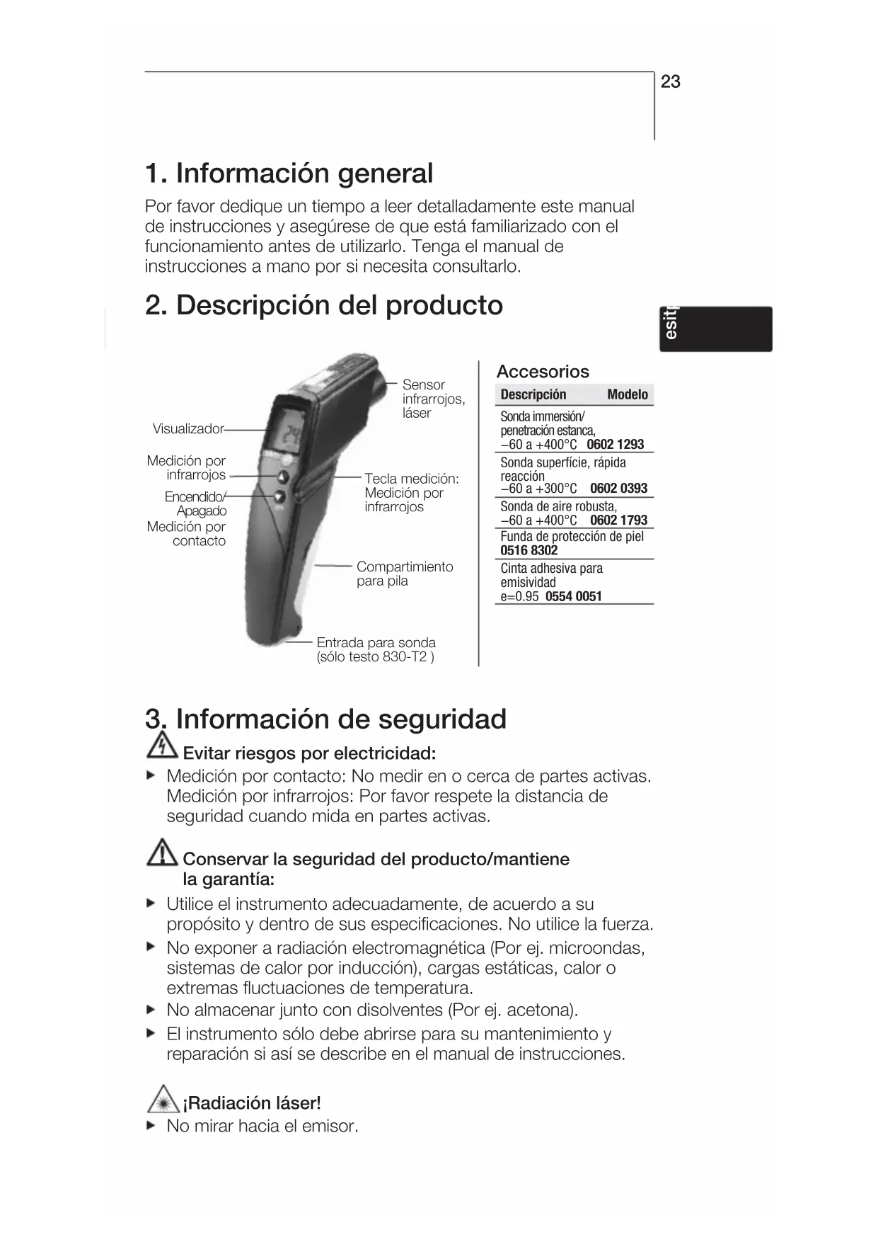 Evitar riesgos por electricidad: Medición por contacto: No medir en o cerca de partes activas. Medición por infrarrojos: Por favor respete la distancia de seguridad cuando mida en partes activas. Conservar la seguridad del producto/mantiene la garantía: Utilice el instrumento adecuadamente, de acuerdo a su propósito y dentro de sus especificaciones. No utilice la fuerza. No exponer a radiación electromagnética (Por ej. microondas, sistemas de calor por inducción), cargas estáticas, calor o extremas fluctuaciones de temperatura. No almacenar junto con disolventes (Por ej. acetona). El instrumento sólo debe abrirse para su mantenimiento y reparación si así se describe en el manual de instrucciones. ¡Radiación láser! No mirar hacia el emisor. deenfr esitptsvnl???? Accesorios Descripción Modelo Sonda immersión/ penetración estanca, 60 a +400°C 0602 1293 Sonda superfície, rápida reacción 60 a +300°C 0602 0393 Sonda de aire robusta, 60 a +400°C 0602 1793 Funda de protección de piel