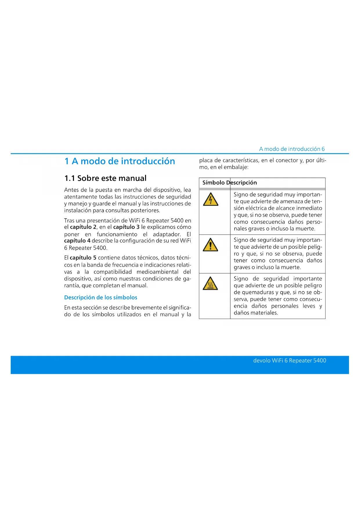Antes de la puesta en marcha del dispositivo, lea atentamente todas las instrucciones de seguridad y manejo y guarde el manual y las instrucciones de instalación para consultas posteriores. Tras una presentación de WiFi 6 Repeater 5400 en el capítulo 2, en el capítulo 3 le explicamos cómo poner en funcionamiento el adaptador. El capítulo 4 describe la configuración de su red WiFi 6 Repeater 5400. El capítulo 5 contiene datos técnicos, datos técni- cos en la banda de frecuencia e indicaciones relati- vas a la compatibilidad medioambiental del dispositivo, así como nuestras condiciones de ga- rantía, que completan el manual. Descripción de los símbolos En esta sección se describe brevemente el significa- do de los símbolos utilizados en el manual y la placa de características, en el conector y, por últi- mo, en el embalaje: Símbolo Descripción Signo de seguridad muy importan- te que advierte de amenaza de ten- sión eléctrica de alcance inmediato y que, si no se observa, puede tener como consecuencia daños perso- nales graves o incluso la muerte. Signo de seguridad muy importan- te que advierte de un posible pelig- ro y que, si no se observa, puede tener como consecuencia daños graves o incluso la muerte. Signo de seguridad importante que advierte de un posible peligro de quemaduras y que, si no se ob- serva, puede tener como consecu- encia daños personales leves y daños materiales. WiFi_6_Repeater_5400.book Seite 6 Freitag, 3. Juni 2022 11:02 117 A modo de introducción devolo WiFi 6 Repeater 5400 Signo de seguridad importante que advierte de una situación po- tencialmente peligrosa que involu- cra un riesgo de tropiezo y que, si no se observa, puede tener como consecuencia daños personales. Aviso importante que se recomien- da tener en cuenta, ya que podrían producirse daños materiales. El dispositivo solo puede utilizarse en espacios secos y cerrados. Sólo aplicable a los dispositivos con Wi-Fi en la banda de 5 GHz: Las conexiones Wi-Fi en la banda de 5 GHz de 5,15 a 5,35 GHz están destinadas exclusivamente al fun- cionamiento en recintos cerrados. Este dispositivo es un producto con protección de clase II. Todos los Símbolo Descripción Con el marcado CE, el fabricante/ responsable declara que el produc- to cumple todas las normas euro- peas vigentes y que este ha sido sometido a los procedimientos de evaluación de la conformidad obli- gatorios. Se usa para evitar los residuos de dispositivos eléctricos y electróni- cos y para reducir dichos residuos mediante la reutilización, el recicla- je y otras formas de aprovecha- miento. Además, fija estándares mínimos para el tratamiento de dispositivos eléctricos y electróni- cos antiguos en la UE, AELC y Reino Unido. Información adicional y consejos sobre aspectos básicos y para la configuración del dispositivo. Marca la finalización de una acción Símbolo Descripción WiFi_6_Repeater_5400.book Seite 7 Freitag, 3. Juni 2022 11:02 11A modo de introducción 8 devolo WiFi 6 Repeater 5400