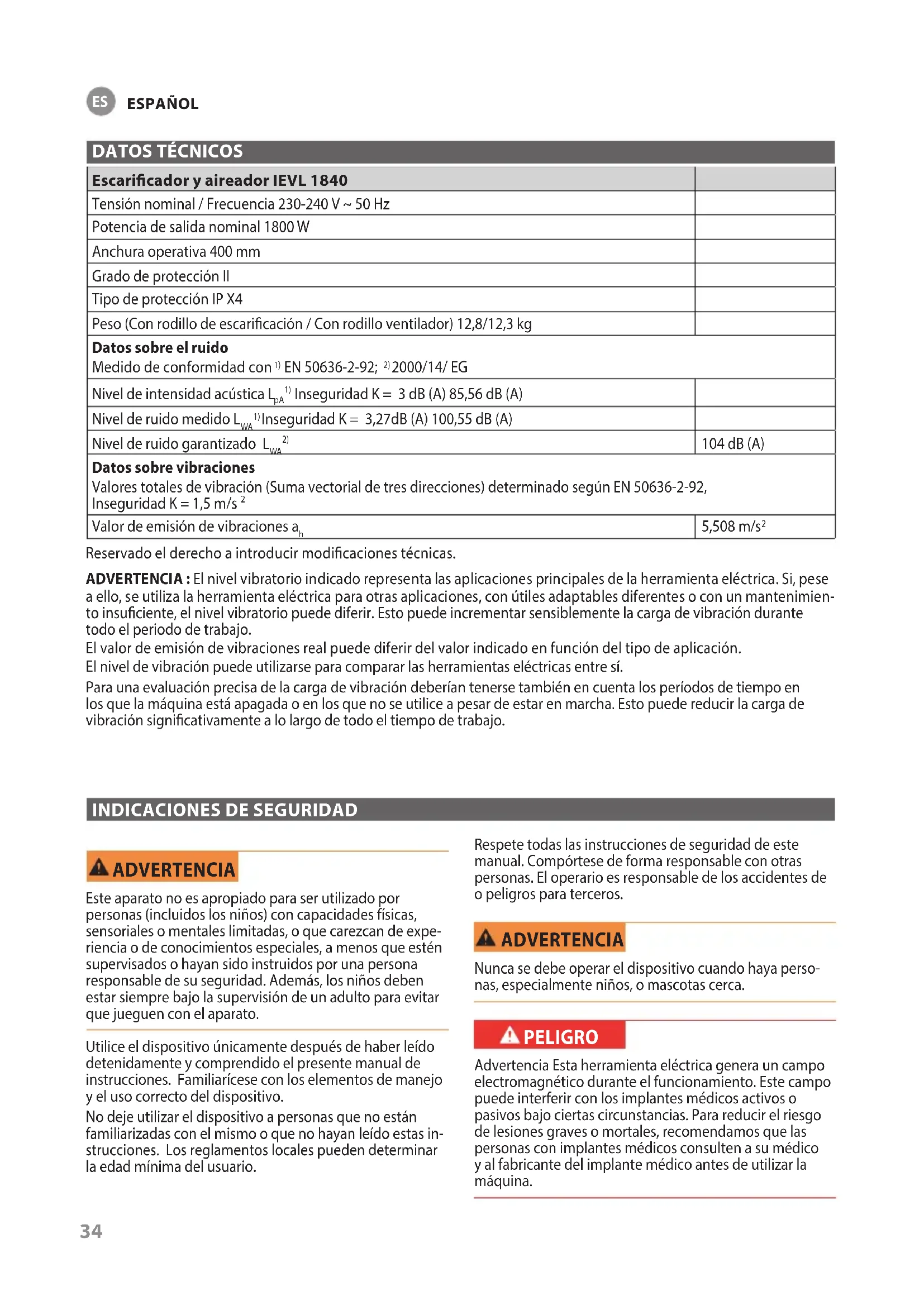 ADVERTENCIA Este aparato no es apropiado para ser utilizado por personas (incluidos los niños) con capacidades físicas, sensoriales o mentales limitadas, o que carezcan de expe- riencia o de conocimientos especiales, a menos que estén supervisados o hayan sido instruidos por una persona responsable de su seguridad. Además, los niños deben estar siempre bajo la supervisión de un adulto para evitar que jueguen con el aparato. Utilice el dispositivo únicamente después de haber leído detenidamente y comprendido el presente manual de instrucciones. Familiarícese con los elementos de manejo y el uso correcto del dispositivo. No deje utilizar el dispositivo a personas que no están familiarizadas con el mismo o que no hayan leído estas in- strucciones. Los reglamentos locales pueden determinar la edad mínima del usuario. Respete todas las instrucciones de seguridad de este manual. Compórtese de forma responsable con otras personas. El operario es responsable de los accidentes de o peligros para terceros. ADVERTENCIA Nunca se debe operar el dispositivo cuando haya perso- nas, especialmente niños, o mascotas cerca. PELIGRO Advertencia Esta herramienta eléctrica genera un campo electromagnético durante el funcionamiento. Este campo puede interferir con los implantes médicos activos o pasivos bajo ciertas circunstancias. Para reducir el riesgo de lesiones graves o mortales, recomendamos que las personas con implantes médicos consulten a su médico y al fabricante del implante médico antes de utilizar la máquina.