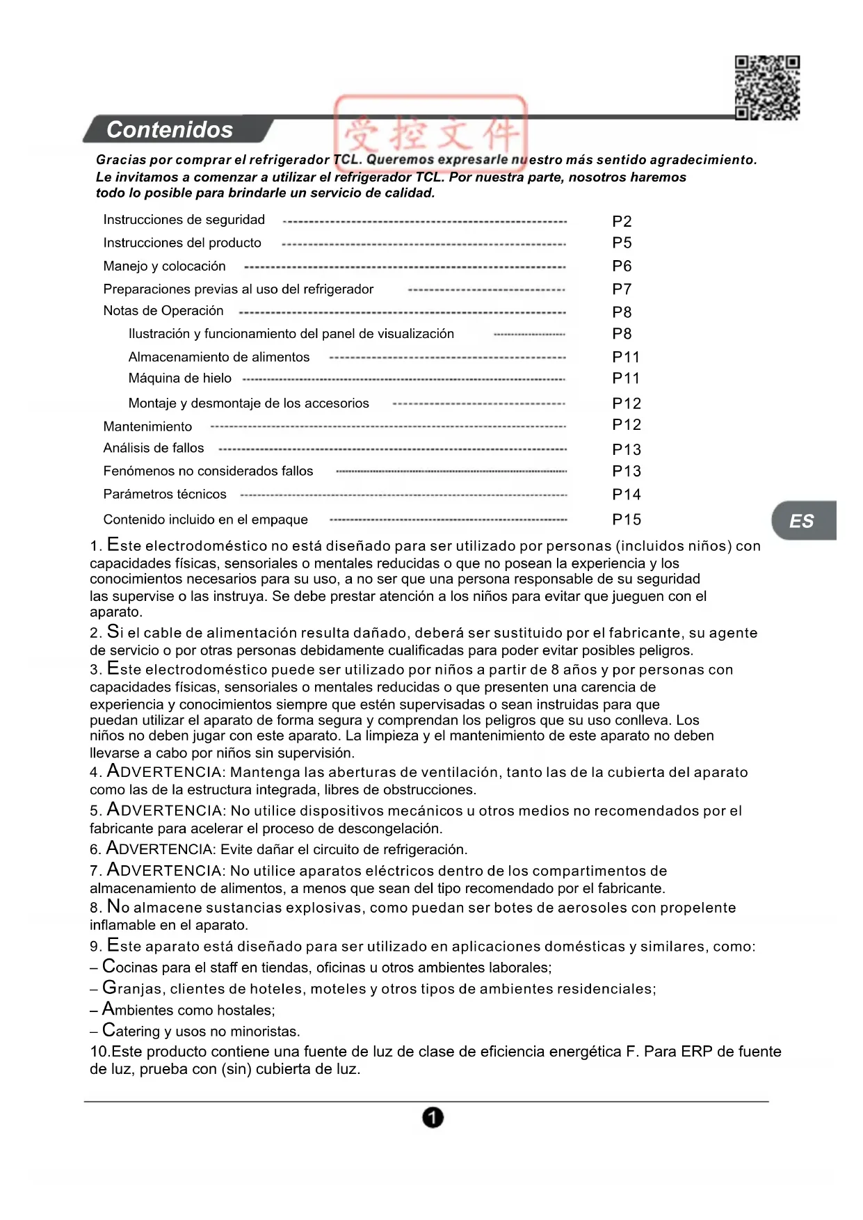 Le invitamos a comenzar a utilizar el refrigerador TCL. Por nuestra parte, nosotros haremos todo lo posible para brindarle un servicio de calidad. Instrucciones de seguridad Instrucciones del producto Manejo y colocación Preparaciones previas al uso del refrigerador Notas de Operación Ilustración y funcionamiento del panel de visualización Almacenamiento de alimentos Máquina de hielo Montaje y desmontaje de los accesorios Mantenimiento Análisis de fallos Fenómenos no considerados fallos Parámetros técnicos Contenido incluido en el empaque