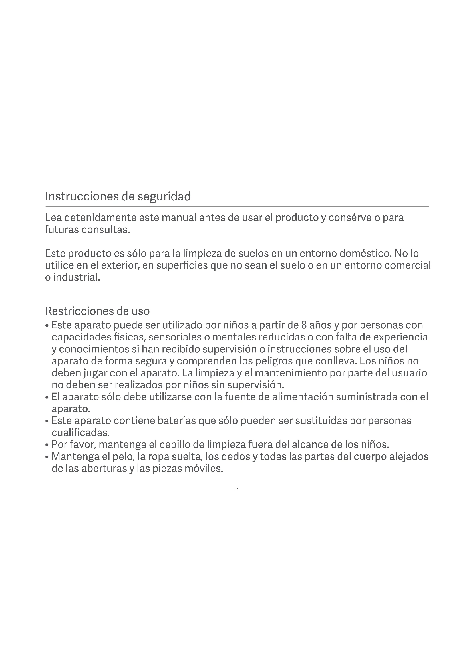 - Mantenga el pelo, la ropa suelta, los dedos y todas las partes del cuerpo alejados de las aberturas y las piezas móviles. Lea detenidamente este manual antes de usar el producto y consérvelo para futuras consultas. Este producto es sólo para la limpieza de suelos en un entorno doméstico. No lo utilice en el exterior, en superficies que no sean el suelo o en un entorno comercial o industrial.18