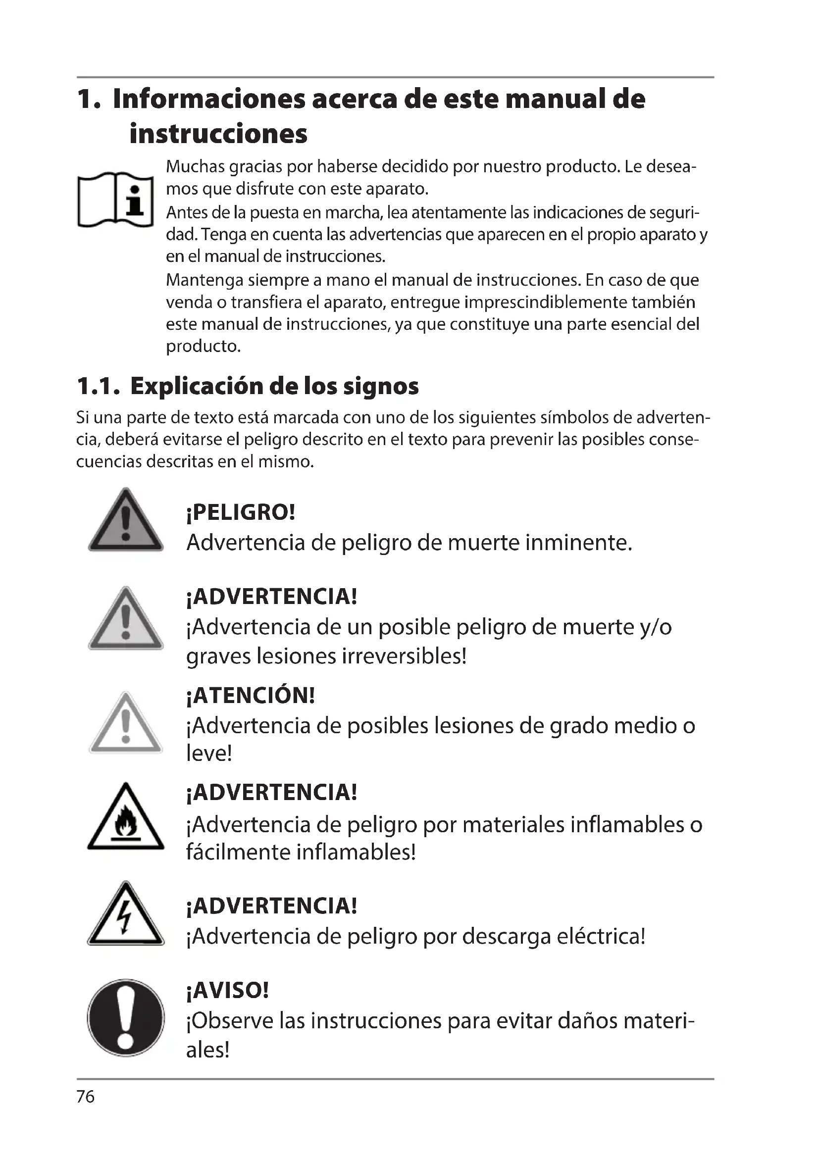 instrucciones Muchas gracias por haberse decidido por nuestro producto. Le desea- mos que disfrute con este aparato. Antes de la puesta en marcha, lea atentamente las indicaciones de seguri- dad. Tenga en cuenta las advertencias que aparecen en el propio aparato y en el manual de instrucciones. Mantenga siempre a mano el manual de instrucciones. En caso de que venda o transfiera el aparato, entregue imprescindiblemente también este manual de instrucciones, ya que constituye una parte esencial del producto. 1.1. Explicación de los signos Si una parte de texto está marcada con uno de los siguientes símbolos de adverten- cia, deberá evitarse el peligro descrito en el texto para prevenir las posibles conse- cuencias descritas en el mismo. ¡PELIGRO! Advertencia de peligro de muerte inminente. ¡ADVERTENCIA! ¡Advertencia de un posible peligro de muerte y/o graves lesiones irreversibles! ¡ATENCIÓN! ¡Advertencia de posibles lesiones de grado medio o leve! ¡ADVERTENCIA! ¡Advertencia de peligro por materiales inflamables o fácilmente inflamables! ¡ADVERTENCIA! ¡Advertencia de peligro por descarga eléctrica! ¡AVISO! ¡Observe las instrucciones para evitar daños materi- ales!77