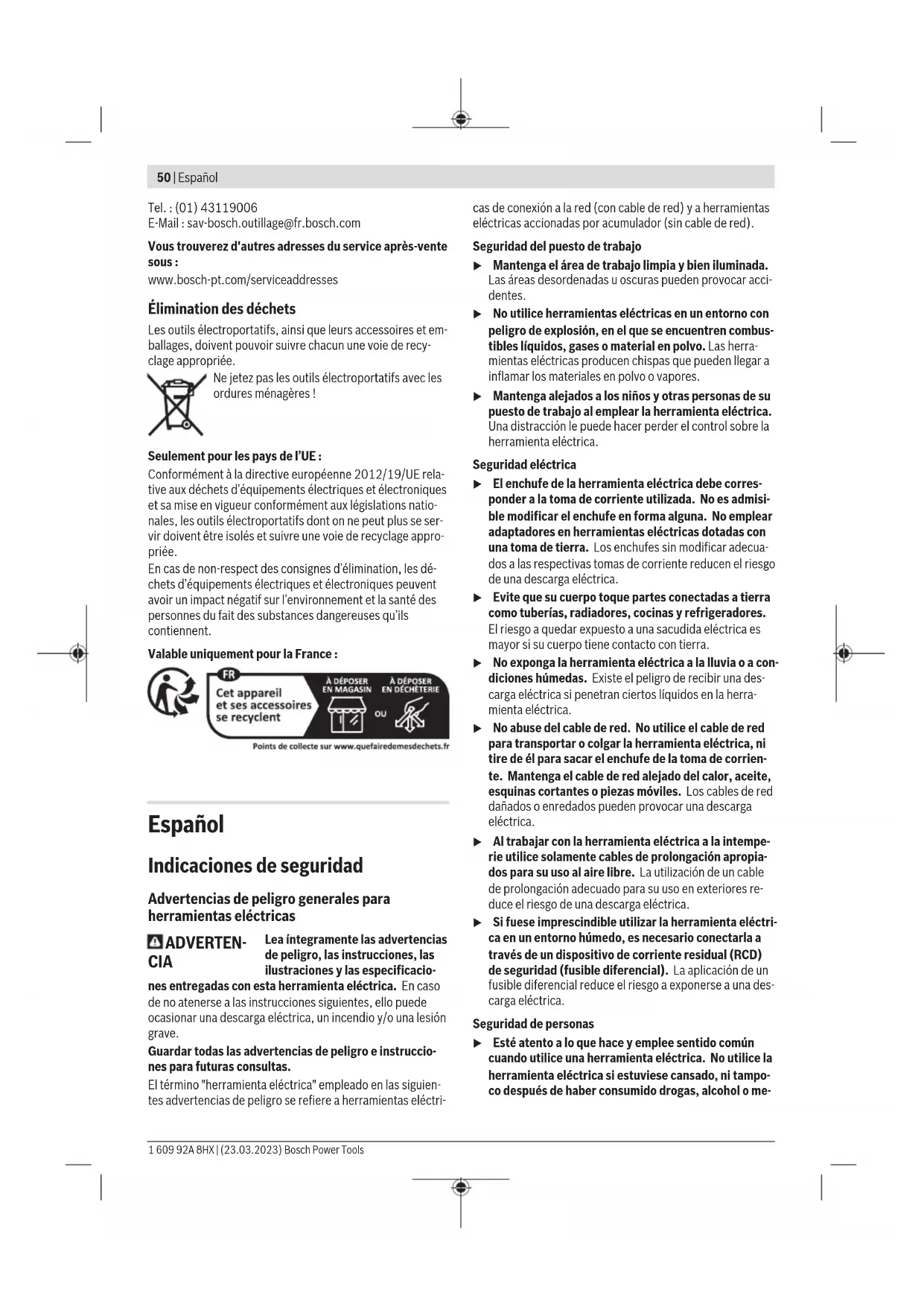 Avant de transporter l’outil électroportatif, procédez comme suit: – Desserrez la vis de blocage(1) (au cas où celle-ci serait serrée). Tirez le bras d’outil complètement vers l’avant et resserrez la vis de serrage. – Assurez-vous que la butée de profondeur (39) est bascu- lée à fond vers l’arrière et que la vis d’ajustage (38) ne touche rien lors du déplacement du bras d’outil. – Placez l’outil électroportatif dans la position de transport. – Enlevez tous les accessoires qui ne peuvent pas être fixés solidement à l’outil électroportatif et qui risquent donc de tomber. Transportez, si possible, les lames de scie en- core inutilisées dans un conteneur fermé. – Positionnez la poignée de transport (3) à la verticale. – Portez l’outil électroportatif par la poignée de transport (3) ou par les poignées encastrées (61) placées de chaque côté de la table. u Pour transporter l’outil électroportatif, ne le saisissez qu’au niveau des dispositifs de transport, jamais au ni- veau des dispositifs de protection, rallonges ou appuis de pièce. Entretien et Service après‑vente Nettoyage et entretien u Débranchez le câble d’alimentation de la prise avant d’effectuer des travaux quels qu’il soient sur l’outil électroportatif. u Tenez toujours propres l’outil électroportatif ainsi que les fentes de ventilation afin d’obtenir un travail im- peccable et sûr. Dans le cas où il s’avère nécessaire de remplacer le câble d’alimentation, confiez le remplacement à Bosch ou une sta- tion de Service Après-Vente agréée pour outillage Bosch afin de ne pas compromettre la sécurité. Le capot de protection à mouvement pendulaire doit tou- jours pouvoir bouger librement et fermer automatiquement. Veillez pour cela à ce que le pourtour du capot de protection à mouvement pendulaire reste propre. Après chaque opération de travail, enlevez les poussières et les copeaux à l’aide d’un pinceau ou en soufflant avec de l’air comprimé. Nettoyez régulièrement le galet coulissant (13). Mesures visant à réduire le niveau sonore Mesures prises par le fabricant: – Démarrage progressif – Fourniture avec une lame de scie spécialement conçue pour une réduction du niveau sonore Mesures prises par l’utilisateur: – Montage permettant une réduction des vibrations sur une surface de travail stable – Utilisation de lames de scie avec fonctions permettant de réduire le niveau sonore – Nettoyage régulier de la lame de scie et de l’outil électro- portatif Service après-vente et conseil utilisateurs Notre Service après-vente répond à vos questions concer- nant la réparation et l’entretien de votre produit et les pièces de rechange. Vous trouverez des vues éclatées et des infor- mations sur les pièces de rechange sur le site : www.bosch-pt.com L’équipe de conseil utilisateurs Bosch se tient à votre dispo- sition pour répondre à vos questions concernant nos pro- duits et leurs accessoires. Pour toute demande de renseignement ou toute commande de pièces de rechange, précisez impérativement la réfé- rence à 10chiffres figurant sur l’étiquette signalétique du produit. France Réparer un outil Bosch n’a jamais été aussi simple, et ce, en moins de 5 jours, grâce à SAV DIRECT, notre formulaire de retour en ligne que vous trouverez sur notre site internet www.bosch-pt.fr à la rubrique Services. Vous y trouverez également notre boutique de pièces détachées en ligne où vous pouvez passer directement vos commandes. Vous êtes un utilisateur, contactez : Le Service Clientèle Bosch Outillage Electroportatif Tel.: 0970821226 (Numéro non surtaxé au prix d'un ap- pel local) E-Mail: sav.outillage-electroportatif@fr.bosch.com Vous êtes un revendeur, contactez: Robert Bosch (France) S.A.S. Service Après-Vente Electroportatif 126, rue de Stalingrad 93705 DRANCY Cédex Bosch Power Tools 1 609 92A 8HX | (23.03.2023)50 | Español Tel.: (01) 43119006 E-Mail: sav-bosch.outillage@fr.bosch.com Vous trouverez d'autres adresses du service après-vente sous: www.bosch-pt.com/serviceaddresses Élimination des déchets Les outils électroportatifs, ainsi que leurs accessoires et em- ballages, doivent pouvoir suivre chacun une voie de recy- clage appropriée. Ne jetez pas les outils électroportatifs avec les ordures ménagères! Seulement pour les pays de l’UE : Conformément à la directive européenne 2012/19/UE rela- tive aux déchets d’équipements électriques et électroniques et sa mise en vigueur conformément aux législations natio- nales, les outils électroportatifs dont on ne peut plus se ser- vir doivent être isolés et suivre une voie de recyclage appro- priée. En cas de non-respect des consignes d’élimination, les dé- chets d’équipements électriques et électroniques peuvent avoir un impact négatif sur l’environnement et la santé des personnes du fait des substances dangereuses qu’ils contiennent. Valable uniquement pour la France: Español Indicaciones de seguridad Advertencias de peligro generales para herramientas eléctricas ADVERTEN- CIA Lea íntegramente las advertencias de peligro, las instrucciones, las ilustraciones y las especificacio- nes entregadas con esta herramienta eléctrica. En caso de no atenerse a las instrucciones siguientes, ello puede ocasionar una descarga eléctrica, un incendio y/o una lesión grave. Guardar todas las advertencias de peligro e instruccio- nes para futuras consultas. El término "herramienta eléctrica" empleado en las siguien- tes advertencias de peligro se refiere a herramientas eléctri- cas de conexión a la red (con cable de red) y a herramientas eléctricas accionadas por acumulador (sin cable de red). Seguridad del puesto de trabajo u Mantenga el área de trabajo limpia y bien iluminada. Las áreas desordenadas u oscuras pueden provocar acci- dentes. u No utilice herramientas eléctricas en un entorno con peligro de explosi