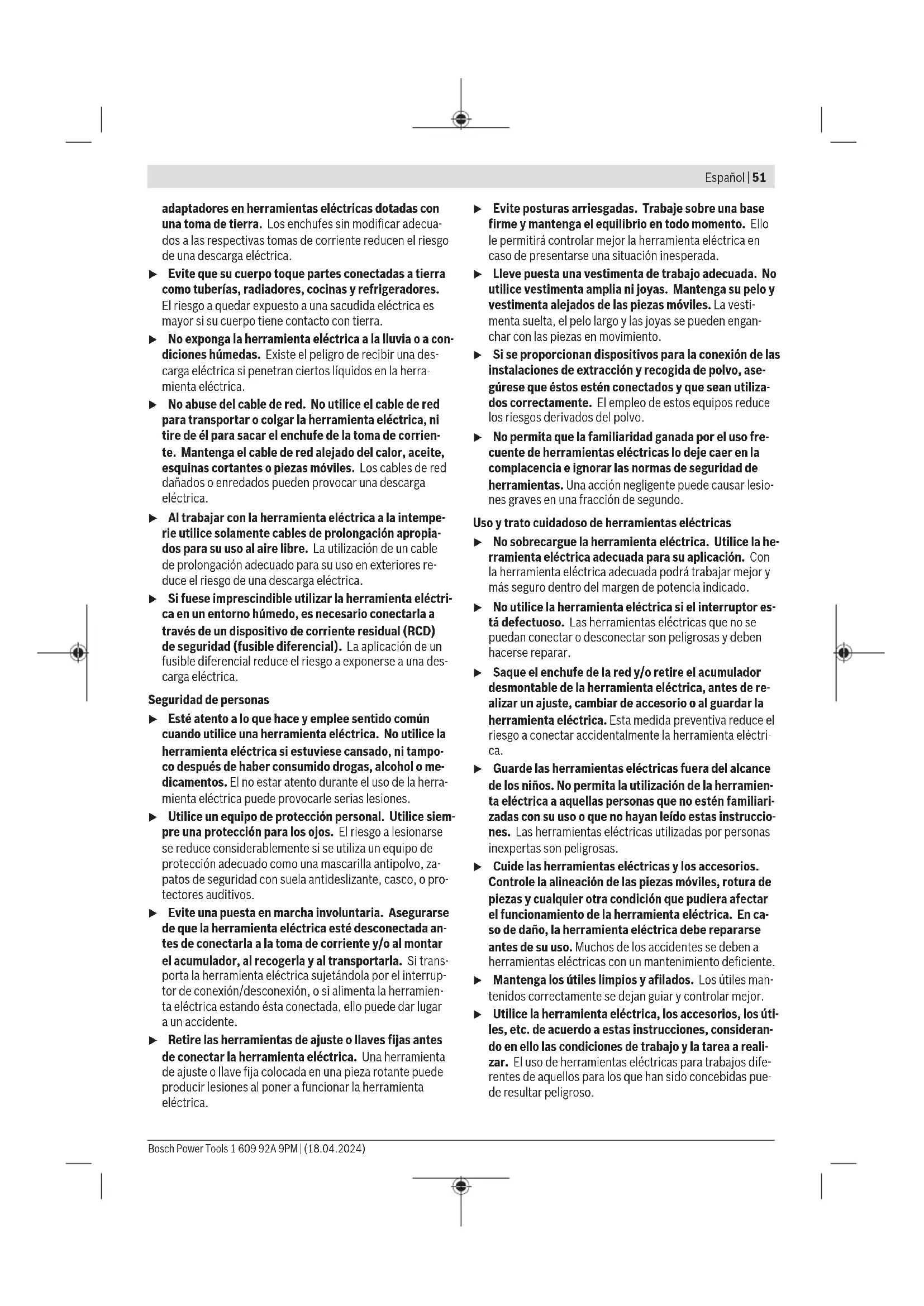Avant de transporter l’outil électroportatif, procédez comme suit: – Desserrez la vis de blocage(1) (au cas où celle-ci serait serrée). Tirez le bras d’outil complètement vers l’avant et resserrez la vis de serrage. – Assurez-vous que la butée de profondeur (39) est bascu- lée à fond vers l’arrière et que la vis d’ajustage (38) ne touche rien lors du déplacement du bras d’outil. – Placez l’outil électroportatif dans la position de transport. – Enlevez tous les accessoires qui ne peuvent pas être fixés solidement à l’outil électroportatif et qui risquent donc de tomber. Transportez, si possible, les lames de scie en- core inutilisées dans un conteneur fermé. – Positionnez la poignée de transport (3) à la verticale. – Portez l’outil électroportatif par la poignée de transport (3) ou par les poignées encastrées (61) placées de chaque côté de la table. u Pour transporter l’outil électroportatif, ne le saisissez qu’au niveau des dispositifs de transport, jamais au ni- veau des dispositifs de protection, rallonges ou appuis de pièce. Entretien et Service après‑vente Nettoyage et entretien u Débranchez le câble d’alimentation de la prise avant d’effectuer des travaux quels qu’il soient sur l’outil électroportatif. u Tenez toujours propres l’outil électroportatif ainsi que les fentes de ventilation afin d’obtenir un travail im- peccable et sûr. Dans le cas où il s’avère nécessaire de remplacer le câble d’alimentation, confiez le remplacement à Bosch ou une sta- tion de Service Après-Vente agréée pour outillage Bosch afin de ne pas compromettre la sécurité. Le capot de protection à mouvement pendulaire doit tou- jours pouvoir bouger librement et fermer automatiquement. Veillez pour cela à ce que le pourtour du capot de protection à mouvement pendulaire reste propre. Après chaque opération de travail, enlevez les poussières et les copeaux à l’aide d’un pinceau ou en soufflant avec de l’air comprimé. Nettoyez régulièrement le galet coulissant (13). Mesures visant à réduire le niveau sonore Mesures prises par le fabricant: Bosch Power Tools 1 609 92A 9PM | (18.04.2024)50 | Español – Démarrage progressif – Fourniture avec une lame de scie spécialement conçue pour une réduction du niveau sonore Mesures prises par l’utilisateur: – Montage permettant une réduction des vibrations sur une surface de travail stable – Utilisation de lames de scie avec fonctions permettant de réduire le niveau sonore – Nettoyage régulier de la lame de scie et de l’outil électro- portatif Service après-vente et conseil utilisateurs Notre Service après-vente répond à vos questions concer- nant la réparation et l’entretien de votre produit et les pièces de rechange. Vous trouverez des vues éclatées et des infor- mations sur les pièces de rechange sur le site : www.bosch-pt.com L’équipe de conseil utilisateurs Bosch se tient à votre dispo- sition pour répondre à vos questions concernant nos pro- duits et leurs accessoires. Pour toute demande de renseignement ou toute commande de pièces de rechange, précisez impérativement la réfé- rence à 10chiffres figurant sur l’étiquette signalétique du produit. France Réparer un outil Bosch n’a jamais été aussi simple, et ce, en moins de 5 jours, grâce à SAV DIRECT, notre formulaire de retour en ligne que vous trouverez sur notre site internet www.bosch-pt.fr à la rubrique Services. Vous y trouverez également notre boutique de pièces détachées en ligne où vous pouvez passer directement vos commandes. Vous êtes un utilisateur, contactez : Le Service Clientèle Bosch Outillage Electroportatif Tel.: 0970821226 (Numéro non surtaxé au prix d'un ap- pel local) E-Mail: sav.outillage-electroportatif@fr.bosch.com Vous êtes un revendeur, contactez: Robert Bosch (France) S.A.S. Service Après-Vente Electroportatif 126, rue de Stalingrad 93705 DRANCY Cédex Tel.: (01) 43119006 E-Mail: sav-bosch.outillage@fr.bosch.com Vous trouverez d'autres adresses du service après-vente sous: www.bosch-pt.com/serviceaddresses Élimination des déchets Les outils électroportatifs, ainsi que leurs accessoires et em- ballages, doivent pouvoir suivre chacun une voie de recy- clage appropriée. Ne jetez pas les outils électroportatifs avec les ordures ménagères! Seulement pour les pays de l’UE : Les outils électroportatifs usagés doivent être mis au rebut séparément. Utilisez les systèmes de collecte prévus. En cas de non-respect des consignes d’élimination, les dé- chets d’équipements électriques et électroniques peuvent avoir un impact négatif sur l’environnement et la santé des personnes du fait des substances dangereuses qu’ils contiennent. Valable uniquement pour la France: Español Indicaciones de seguridad Advertencias de peligro generales para herramientas eléctricas ADVERTEN- CIA Lea íntegramente las advertencias de peligro, las instrucciones, las ilustraciones y las especificacio- nes entregadas con esta herramienta eléctrica. En caso de no atenerse a las instrucciones siguientes, ello puede ocasionar una descarga eléctrica, un incendio y/o una lesión grave. Guardar todas las advertencias de peligro e instruccio- nes para futuras consultas. El término "herramienta eléctrica" empleado en las siguien- tes advertencias de peligro se refiere a herramientas eléctri- cas de conexión a la red (con cable de red) y a herramientas eléctricas accionadas por acumulador (sin cable de red). Seguridad del puesto de trabajo u Mantenga el área de trabajo limpia y bien iluminada. Las áreas desordenadas u oscuras pueden provocar acci- dentes. u No utilice herramientas eléctricas en un entorno con peligro de explosión, en el que se encuentren combus- tibles líquidos, gases o material en polvo. Las herra- mientas eléctricas producen chispas que pueden llegar a inflamar los materiales en polvo o vapores. u Manten