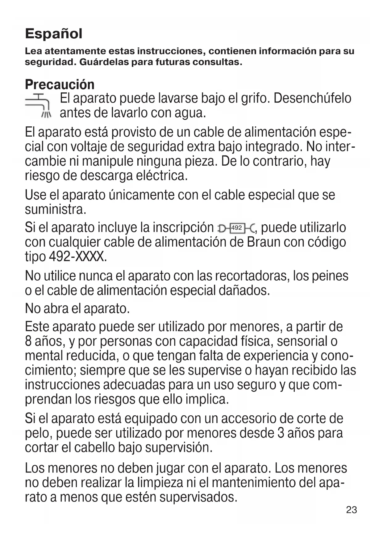 , puede utilizarlo con cualquier cable de alimentación de Braun con código tipo 492-XXXX. No utilice nunca el aparato con las recortadoras, los peines o el cable de alimentación especial dañados. No abra el aparato. Este aparato puede ser utilizado por menores, a partir de 8 años, y por personas con capacidad física, sensorial o mental reducida, o que tengan falta de experiencia y cono- cimiento; siempre que se les supervise o hayan recibido las instrucciones adecuadas para un uso seguro y que com- prendan los riesgos que ello implica. Si el aparato está equipado con un accesorio de corte de pelo, puede ser utilizado por menores desde 3 años para cortar el cabello bajo supervisión. Los menores no deben jugar con el aparato. Los menores no deben realizar la limpieza ni el mantenimiento del apa- rato a menos que estén supervisados. 90012280_Type5542_BT_7350_7340_7330_7320_5365_5360_5342_5340_MN_ANZ.indd 2390012280_Type5542_BT_7350_7340_7330_7320_5365_5360_5342_5340_MN_ANZ.indd 23 13.09.21 09:1913.09.21 09:1924 Descripción 1a Peine de precisión para barba (1–10 mm) 1b Peine de precisión para cabello (11–20 mm)* 1c Peine para las zonas sensibles* 1d Peine fijo 1 (1 mm)* 2a Cabezal recortador** 2b Cabezal recortador para perfilar* 2c Minicabezal de afeitado con lámina* 3 Selector de longitud 4 Botón de encendido/apagado 5 Indicador de carga 6 Toma de corriente 7 Cable especial** 8 Base cargadora*