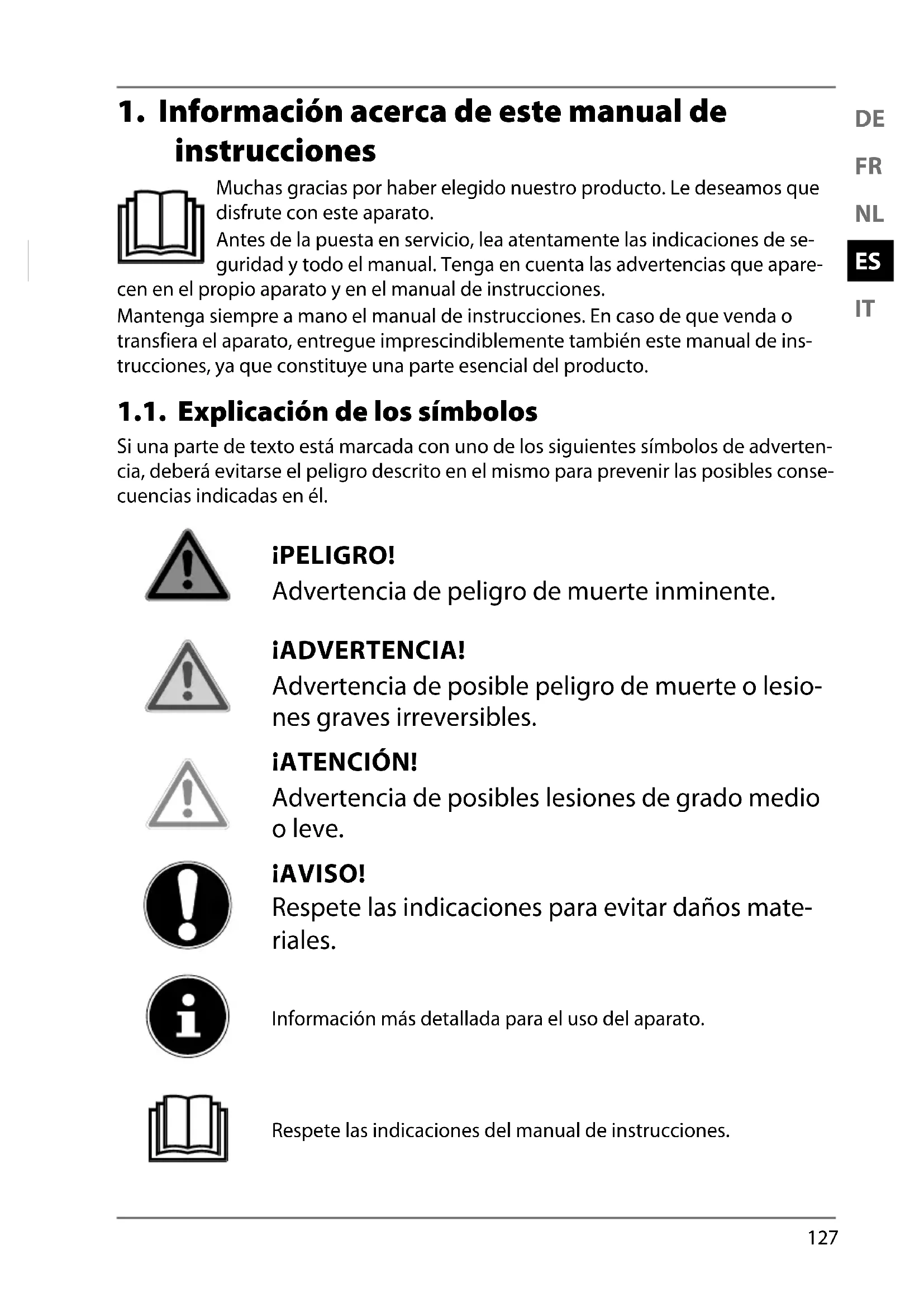 1. Información acerca de este manual de instrucciones ........................... 127