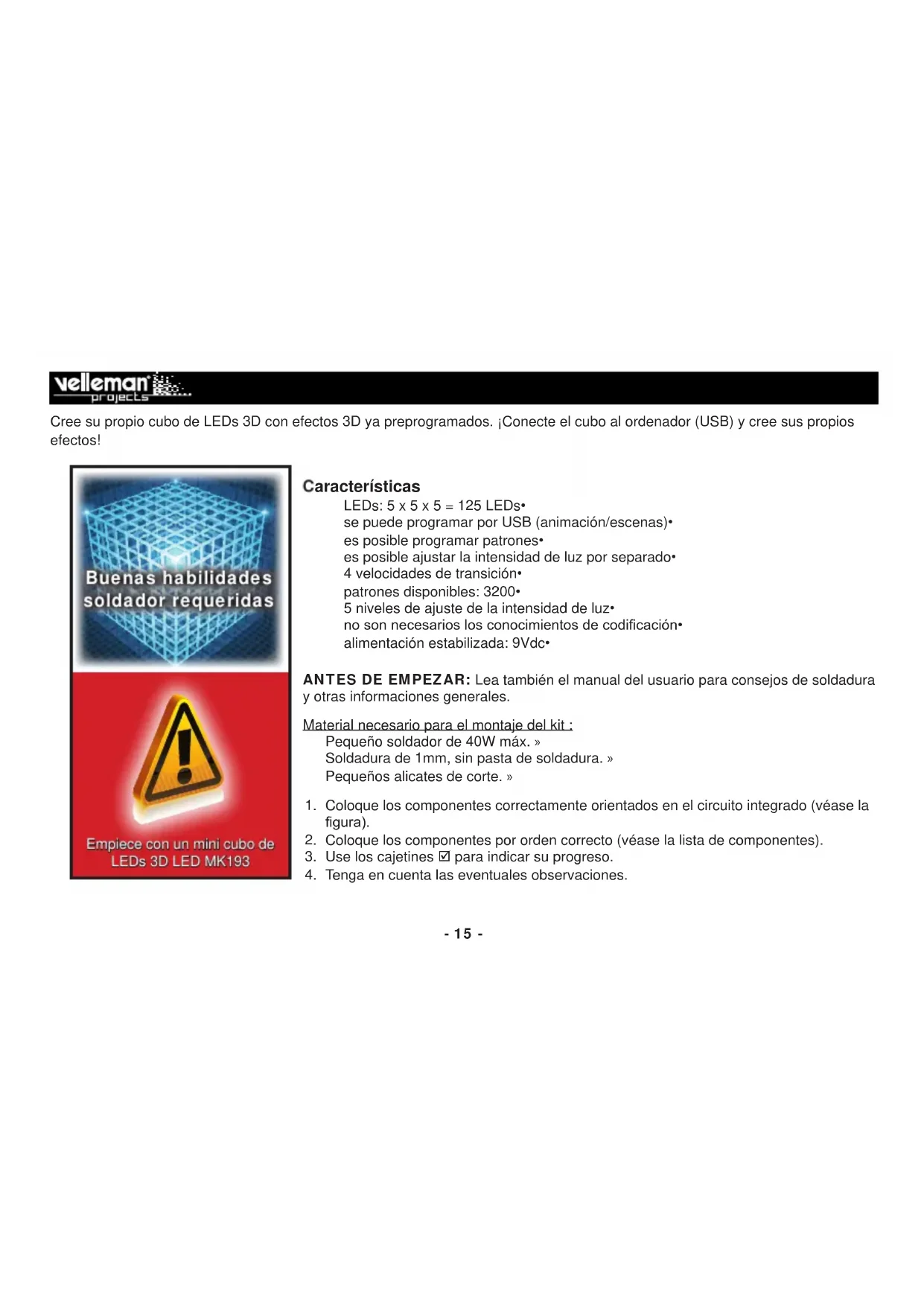 3D-LED-CUBE 5 x 5 x 5 CUBO DE LEDs 3D 5 x 5 x 5 ZUSAMMENBAU 4 Schritt 11: Verbinden Sie nun die LED-Platine über einen 10mm-Abstandsbolzen, einen M3-Bolzen von 20mm und eine M3- Mutter mit der Komponentenplatine (siehe Abb.). SOfTWAREIII. Laden Sie die LED-Cube-Software über www.velleman.eu oder den QR-Code herunter. Características LEDs: 5 x 5 x 5 = 125 LEDs• se puede programar por USB (animación/escenas)• es posible programar patrones• es posible ajustar la intensidad de luz por separado• 4 velocidades de transición• patrones disponibles: 3200• 5 niveles de ajuste de la intensidad de luz• nosonnecesarioslosconocimientosdecodicación• alimentación estabilizada: 9Vdc• ANTES DE EMPEZAR: Lea también el manual del usuario para consejos de soldadura y otras informaciones generales. Material necesario para el montaje del kit : Pequeño soldador de 40W máx. » Soldadura de 1mm, sin pasta de soldadura. » Pequeños alicates de corte. » Coloque los componentes correctamente orientados en el circuito integrado (véase la 1. gura). Coloque los componentes por orden correcto (véase la lista de componentes).2. Use los cajetines 3. þ para indicar su progreso. Tenga en cuenta las eventuales observaciones.4. Cree su propio cubo de LEDs 3D con efectos 3D ya preprogramados. ¡Conecte el cubo al ordenador (USB) y cree sus propios efectos! Empiece con un mini cubo de LEDs 3D LED MK193 Buenas habilidades soldador requeridas Buenas habilidades soldador requeridas- 16 -