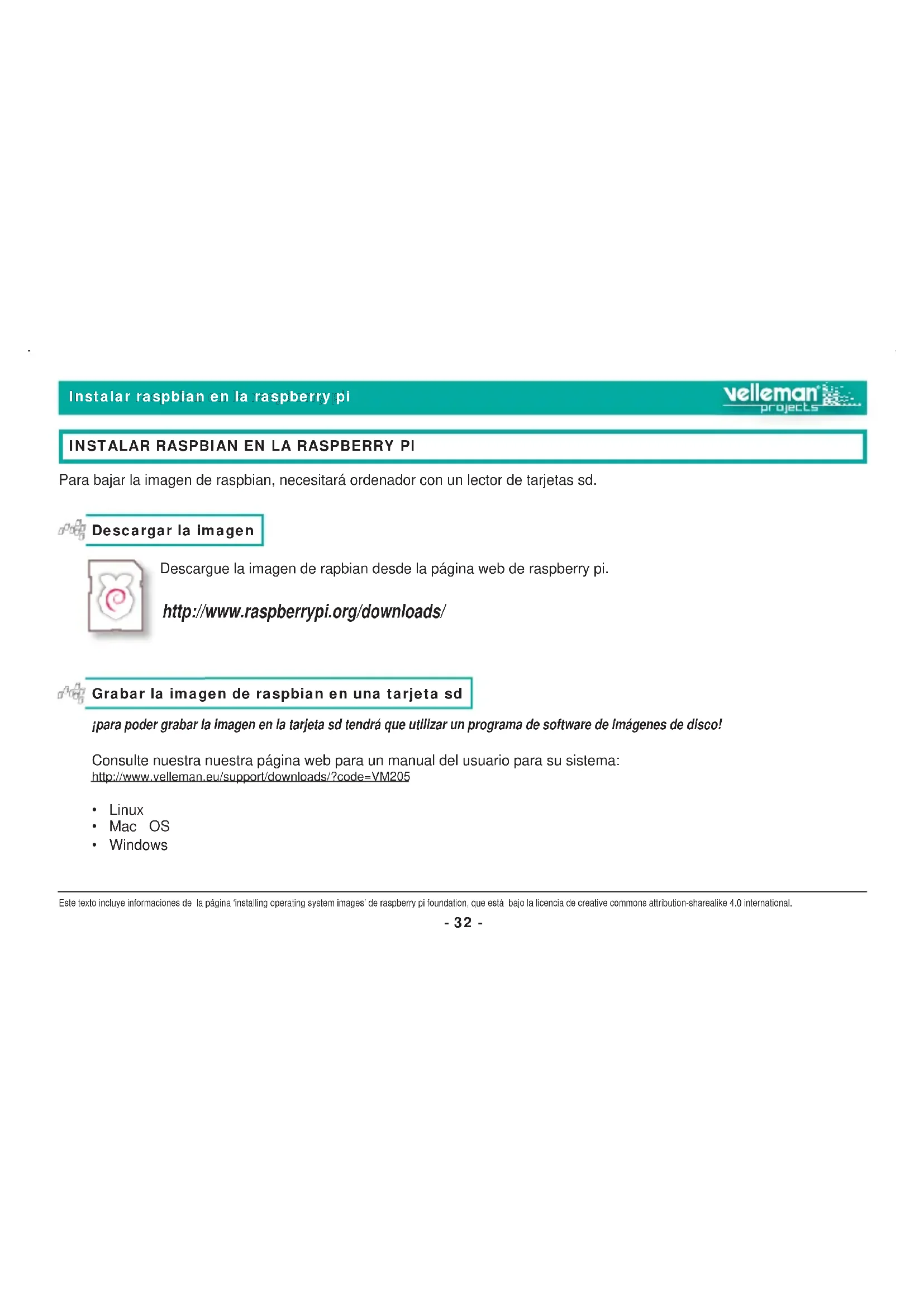 Para bajar la imagen de raspbian, necesitará ordenador con un lector de tarjetas sd. Este texto incluye informaciones de la página ‘installing operating system images’ de raspberry pi foundation, que está bajo la licencia de creative commons attribution-sharealike 4.0 international. Descargar la imagen Descargue la imagen de rapbian desde la página web de raspberry pi. http://www.raspberrypi.org/downloads/ Grabar la imagen de raspbian en una tarjeta sd ¡para poder grabar la imagen en la tarjeta sd tendrá que utilizar un programa de software de imágenes de disco! Consulte nuestra nuestra página web para un manual del usuario para su sistema: http://www.velleman.eu/support/downloads/?code=VM205