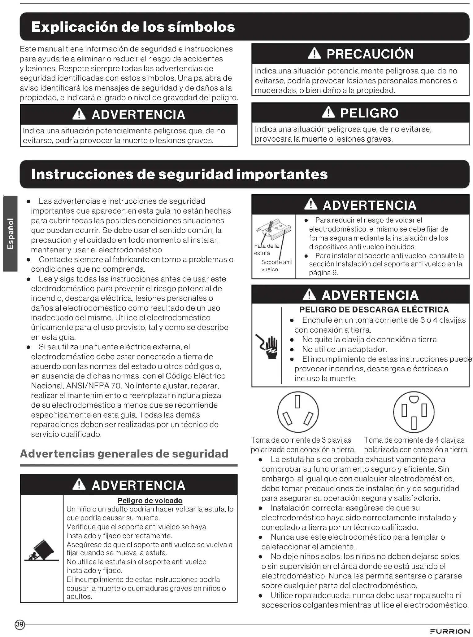 ● Enchufe en un toma corriente de 3 o 4clavijas con conexión a tierra. ● No quite la clavija de conexión a tierra. ● No utilice un adaptador. ● El incumplimiento de estas instrucciones puede provocar incendios, descargas eléctricas o incluso la muerte. Toma de corriente de 3clavijas polarizada con conexión a tierra. Toma de corriente de 4clavijas polarizada con conexión a tierra. ● La estufa ha sido probada exhaustivamente para comprobar su funcionamiento seguro y eficiente. Sin embargo, al igual que con cualquier electrodoméstico, debe tomar precauciones de instalación y de seguridad para asegurar su operación segura y satisfactoria. ● Instalación correcta: asegúrese de que su electrodoméstico haya sido correctamente instalado y conectado a tierra por un técnico calificado. ● Nunca use este electrodoméstico para templar o calefaccionar el ambiente. ● No deje niños solos: los niños no deben dejarse solos o sin supervisión en el área donde se está usando el electrodoméstico. Nunca les permita sentarse o pararse sobre cualquier parte del electrodoméstico. ● Utilice ropa adecuada: nunca debe usar ropa suelta ni accesorios colgantes mientras utilice el electrodoméstico.40 Español ● Mantenimiento realizado por el usuario: no repare ni reemplace ninguna pieza del electrodoméstico a menos que se recomiende específicamente en el manual. Todas las demás reparaciones las debe realizar un técnico calificado. ● Almacenamiento dentro o sobre el electrodoméstico: nunca guarde materiales inflamables dentro de un horno o cerca de los quemadores. ● No arroje agua sobre incendios de grasa: sofoque el fuego o la llama o use un extintor químico seco o de espuma. ● Use manoplas o agarradores de ollas que estén secos para sostener las ollas. Si están húmedos o mojados, pueden provocar quemaduras al tocar superficies calientes debido al vapor. No permita que las manoplas o agarradores de ollas toquen los quemadores calientes. No utilice una toalla u otro paño voluminoso. ● Si el usuario de este electrodoméstico no lo mantiene en el estado en que fue enviado de fábrica o si el aparato no se utiliza exclusivamente para el uso previsto o si el aparato no se mantiene de acuerdo con las instrucciones de este manual, existe el riesgo de que se produzca un incendio que pueda causar lesiones personales, daños materiales o víctimas mortales. ● NO utilice el electrodoméstico si está dañado o no funciona correctamente. ● Utilice el electrodoméstico únicamente para el uso previsto. ● NO use un alargador para conectar este electrodoméstico. Si el cable de alimentación es demasiado corto, haga que un electricista o técnico de servicio cualificado instale una toma de corriente cerca del electrodoméstico. ● No quite etiquetas, advertencias o placas fijadas permanentemente al electrodoméstico. Esto podría anular la garantía. ● Respete todas las normas y ordenanzas locales y nacionales. IMPORTANTE: Esta estufa fue diseñada y fabricada únicamente para usar en hogares y NO SE PUEDE usar en ambientes comerciales. De lo contrario, su garantía quedará anulada. Advertencias sobre la parrilla ● Use recipientes de cocción de tamaño adecuado: este electrodoméstico está equipado con uno o más quemadores de distintos tamaños. Elija utensilios con fondos planos lo suficientemente grandes como para cubrir la superficie del quemador. Usar utensilios de menor tamaño al adecuado expondrá una parte del quemador al contacto directo y podría encender la ropa. La correcta relación de tamaños entre el utensilio y el quemador también mejorará la eficiencia. ● Nunca deje quemadores desatendidos a potencias altas. Los derrames por ebullición generan humos y el derrame de grasa, que podría encenderse. ● Asegúrese de que las bandejas reflectoras o las bandejas de goteo estén en su lugar. De lo contrario, el proceso de cocción podría dañar los componentes protegidos por las mismas. ● Utensilios para cocción vidriados: solo ciertos tipos de utensilios de vidrio, cerámica o barro, u otros utensilios vidriados, son adecuados para utilizar con los quemadores sin romperse, debido a los súbitos cambios de temperatura. ● Las asas de los utensilios deben dejarse apuntando hacia dentro y no extenderse sobre quemadores adyacentes. Para reducir el riesgo de quemaduras, encendido de materiales inflamables y vertidos debidos al contacto accidental con el utensilio, el asa de un utensilio debe colocarse de forma que apunte hacia adentro y no se extienda sobre quemadores adyacentes. ● No moje los quemadores extraíbles: los quemadores nunca se deben sumergir en agua. ● NO TOQUE LOS QUEMADORES O LAS ÁREAS PRÓXIMAS A ELLOS: los quemadores pueden estar calientes aunque su color esté oscuro. Las áreas cercanas a los quemadores pueden calentarse lo suficiente como para provocar quemaduras. Durante y después del uso, no toque ni permita que la ropa u otros materiales inflamables entren en contacto con los quemadores o áreas próximas a ellos hasta que hayan tenido suficiente tiempo para enfriarse. Entre estas áreas se encuentran, por ejemplo la parrilla y las superficies enfrentadas a esta. ● Si la parrilla está a más de 122ºF (50ºC), el ícono Hot Surface