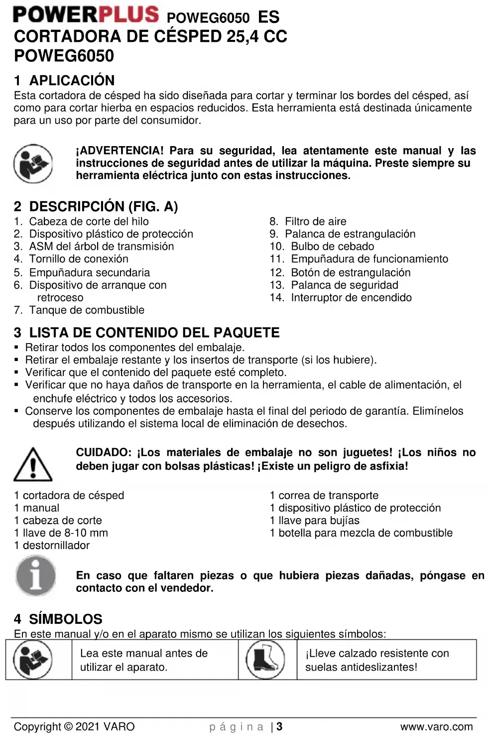 - Utilice sólo el tipo de hilo de corte recomendado por el fabricante. Nunca utilizar un hilo de corte de metal o de sedal de pesca.POWEG6050 ES Copyright © 2021 VARO pág i n a | 6 www.varo.com