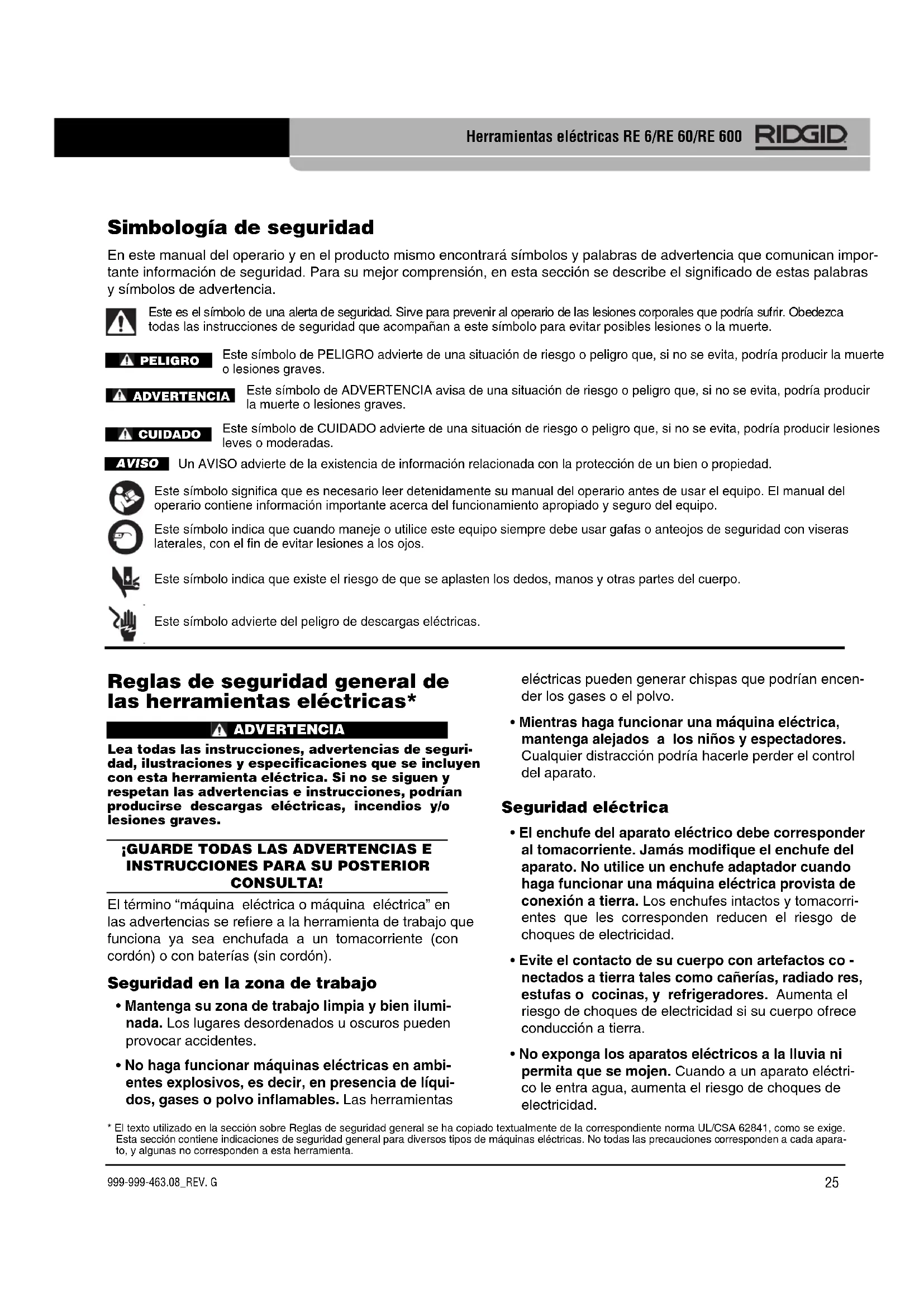 - El texto utilizado en la sección sobre Reglas de seguridad general se ha copiado textualmente de la correspondiente norma UL/CSA 62841, como se exige. Esta sección contiene indicaciones de seguridad general para diversos tipos de máquinas eléctricas. No todas las precauciones corresponden a cada apara- to, y algunas no corresponden a esta herramienta.999-999-463.08_REV. G