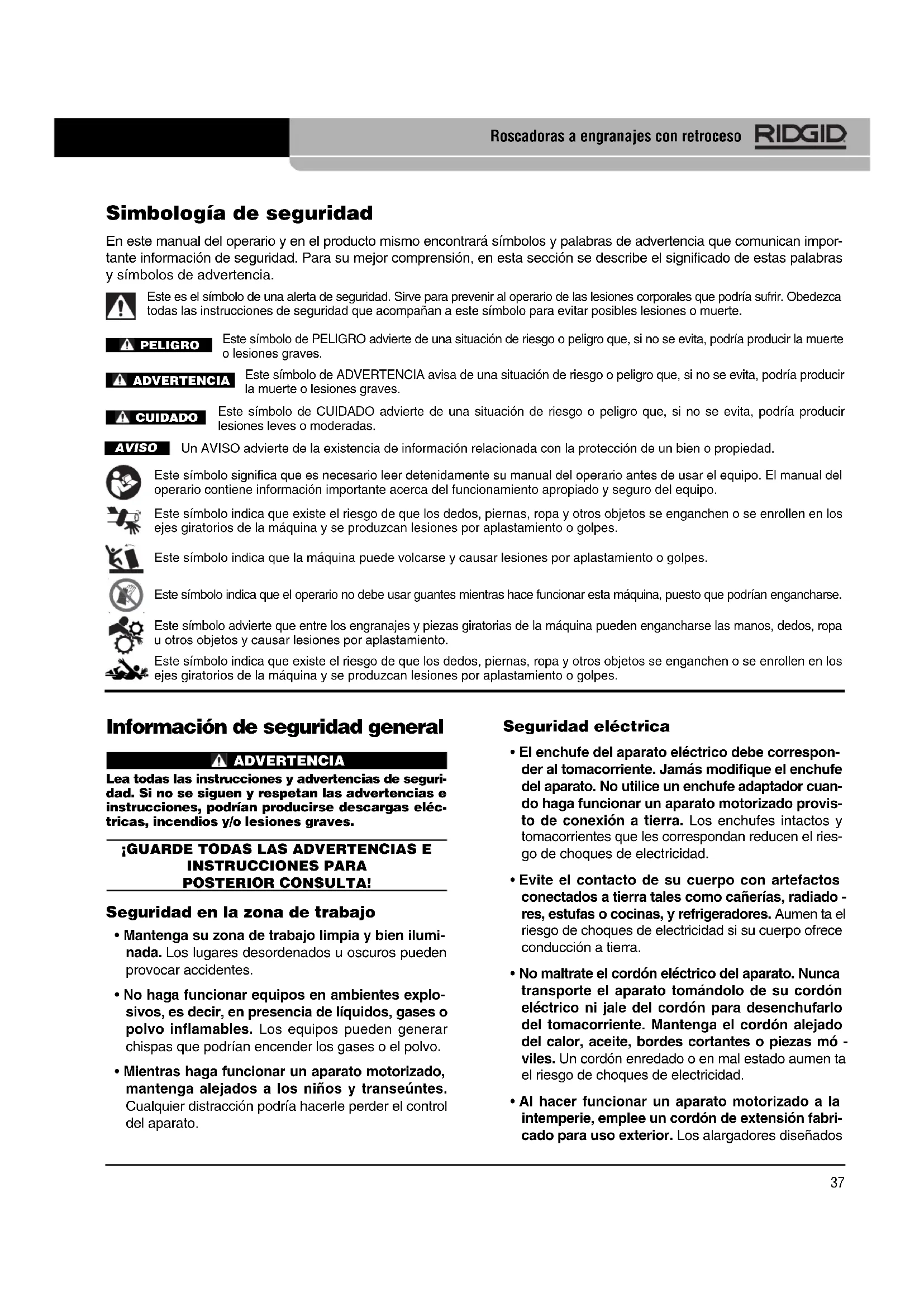 " a 4", y de 4" a 6", respectivamente. Un por- tapiezas a levas se usa para agarrar el tubo mientras el cabezal de terrajas corta las roscas. Se incluye un embrague para que no se atasque al final de la rosca. Las roscadoras pueden usarse para roscas a mano derecha tanto rectas como cónicas, mediante un ajuste sencillo. Vea las especificaciones para las versiones NPT y BSPT. El Modelo 141 y el Modelo 161 pueden impulsarse en dis- tintas formas. Pueden funcionar a mano o con diversas máquinas roscadoras y motopropulsoras de RIDGID. ¡GUARDE ESTAS INSTRUCCIONES! Mantenga este manual junto con la máquina, para que lo use el operario. Seguridad de las roscadoras a engranajes con retroceso