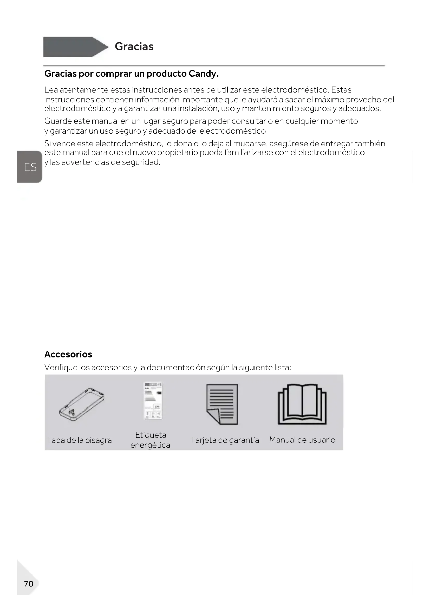 Gracias por comprar un producto Candy. Lea atentamente estas instrucciones antes de utilizar este electrodoméstico. Estas instrucciones contienen información importante que le ayudará a sacar el máximo provecho del electrodoméstico y a garantizar una instalación, uso y mantenimiento seguros y adecuados. Guarde este manual en un lugar seguro para poder consultarlo en cualquier momento y garantizar un uso seguro y adecuado del electrodoméstico. Si vende este electrodoméstico, lo dona o lo deja al mudarse, asegúrese de entregar también este manual para que el nuevo propietario pueda familiarizarse con el electrodoméstico y las advertencias de seguridad. Accesorios Verifique los accesorios y la documentación según la siguiente lista:
