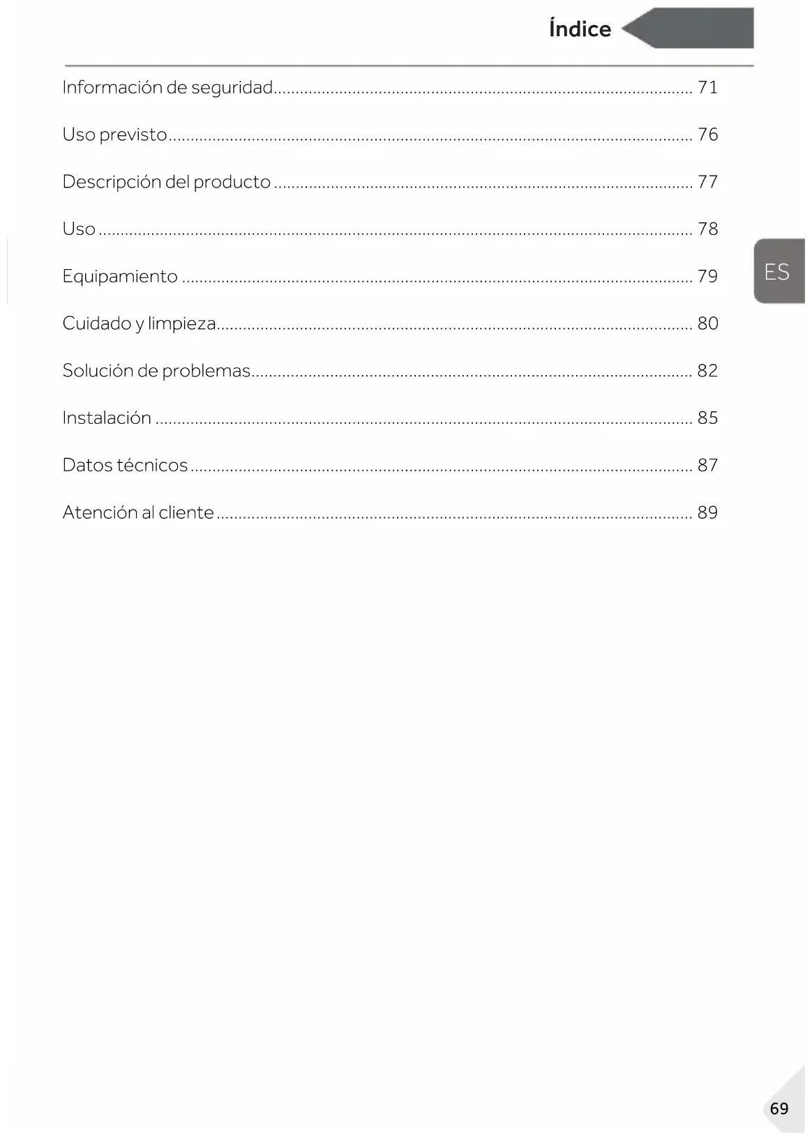 ¡ADVERTENCIA! ► Cuando desenchufe el electrodoméstico, hágalo por la clavija, no por el cable. ► No limpie el electrodoméstico con cepillos duros, cepillos de alambre, detergente en polvo, gasolina, acetato de amilo, acetona y soluciones orgánicas similares, soluciones ácidas o alcalinas. Limpie con un detergente especial para frigoríficos para evitar daños. ► No raspe la escarcha y el hielo con objetos afilados. No utilice aerosoles, calentadores eléctricos como secadores de pelo, limpiadores a vapor u otras fuentes de calor para evitar dañar las piezas de plástico. ► No utilice dispositivos mecánicos ni otros equipos para acelerar el proceso de descongelación, salvo aquellos recomendados por el fabricante. ► Si el cable de alimentación está dañado, debe ser sustituido por el fabricante, por su servicio técnico o por cualquier profesional cualificado similar para evitar riesgos. ► No intente reparar, desmontar o modificar este electrodoméstico por su cuenta. En caso de reparación, póngase en contacto con nuestro servicio de atención al cliente. ► Saque el polvo de la parte posterior de la unidad al menos una vez al año para evitar el riesgo de incendio, así como un mayor consumo de energía. ► No rocíe ni enjuague el electrodoméstico durante la limpieza. ► No use agua pulverizada o vapor para limpiar el electrodoméstico. ► No limpie los estantes de cristal fríos con agua caliente. Un cambio repentino de temperatura puede causar que el cristal se rompa. Información sobre el gas refrigerante ¡ADVERTENCIA! Este electrodoméstico contiene el refrigerante inflamable ISOBUTANO (R600a). Asegúrese de no dañar el circuito refrigerante durante el transporte o la instalación. La fuga de refrigerante puede causar lesiones oculares o incendios. Si se produce algún daño, manténgase alejado de llamas abiertas, ventile bien la habitación y no conecte o desconecte los cables de alimentación de este ni de cualquier otro electrodoméstico. Informe al servicio de atención al cliente. En caso de que los ojos entren en contacto con el refrigerante, enjuáguelos inmediatamente con agua corriente y llame inmediatamente a un oftalmólogo.76 Uso previsto